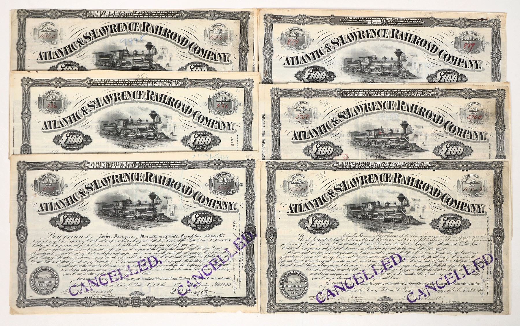 6x 1884-1908 Atlantic & St. Lawrence Railroad bonds with coupons. 1 has tape across top.