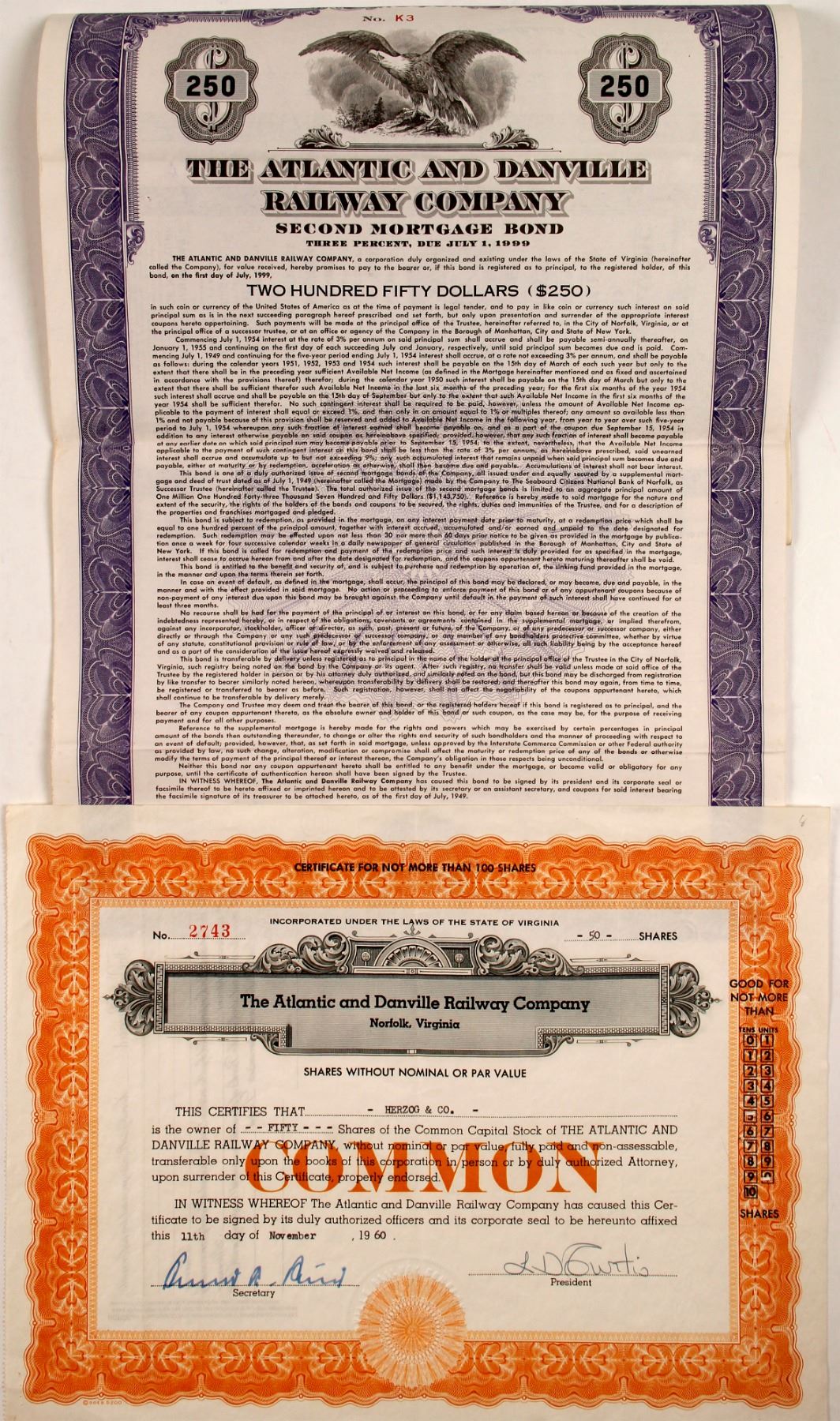 1) Uncancelled fifty shares of Atlantic and Danville Railway Company common stock, certificate number 2743 dated November 11, 1960 signed by L. D. Curtis, president. 2) Uncancelled two hundred fifty shares of second mortgage bond, Atlantic and Danville Railway Company, 3%, number K3, with coupons, payable July 1, 1999. Atlantic and Danville Railway, founded in 1882, operated in Virginia and North Carolina. in 1890 the line between Portsmouth, Virginia and Danville, Virginia opened. In 1962, Norfolk and Western Railway purchased and changed the name to the Norfolk, Franklin and Danville Railway. Ken Prag Collection. State: City: Date: HWAC# 75864