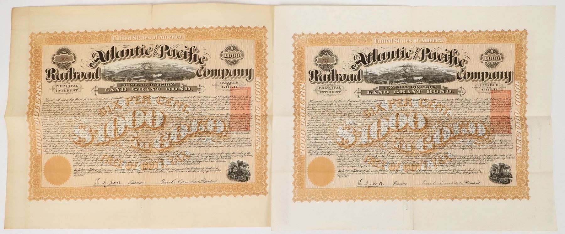 Lot of 2. I/U. Issued 1871. EF cond. Atlantic and Pacific Railroad Co. Bonds, $1000, 6% gold bearer bonds. imprinted underprint revenue stamps. Great vignettes top center complete valley view and lower right 4-4-0 @depot. Henry Seibert & Bros. printers. One bond has a one inch fold separation top right.