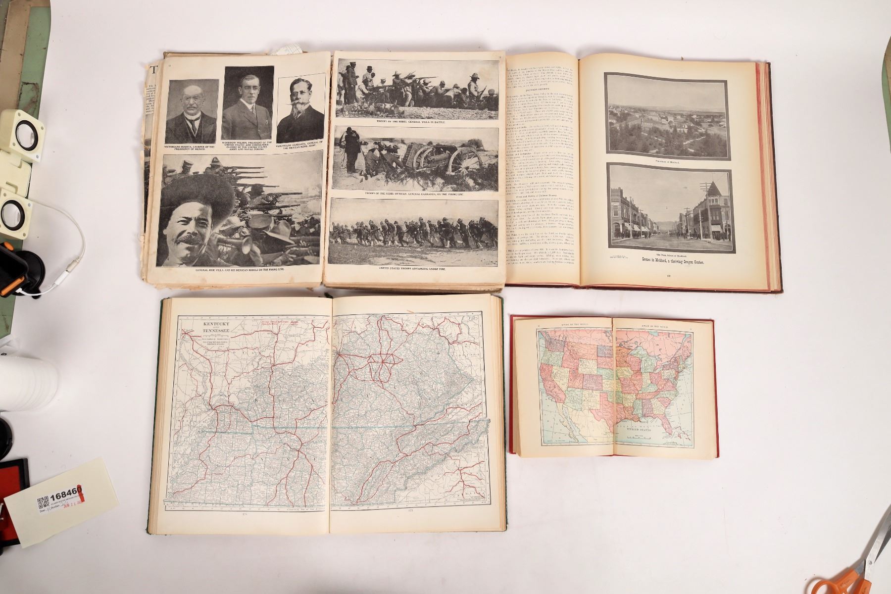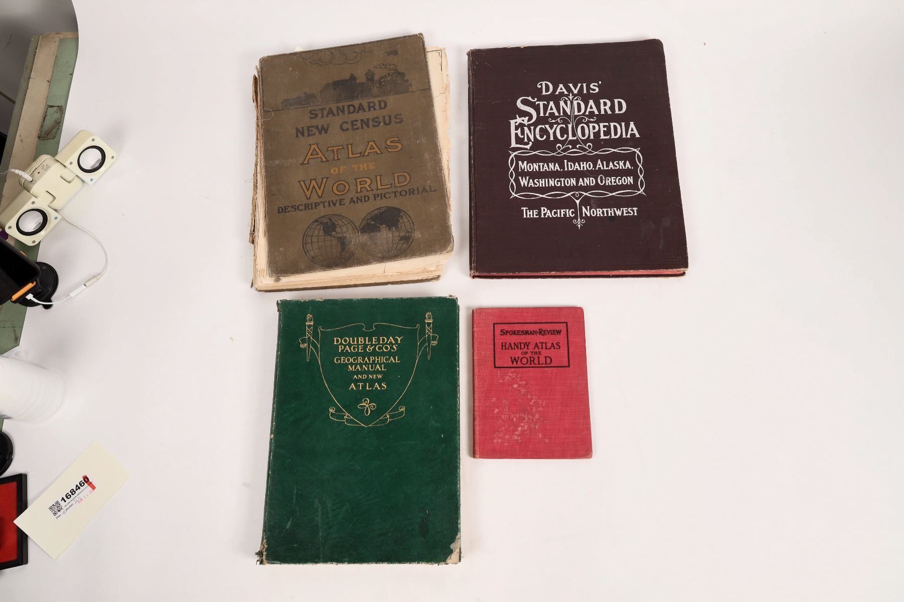 5 atlas'. Standard New Census Atlas of the World, 1916, about first 10pp detached, spine missing, detached front board. Davis' Standard Encyclopedia, The Pacific Northwest 1910. Doubleday Page, Geographic Manual and New Atlas 1917. Spokesman Atlas of the World 1911. About 11 lbs.