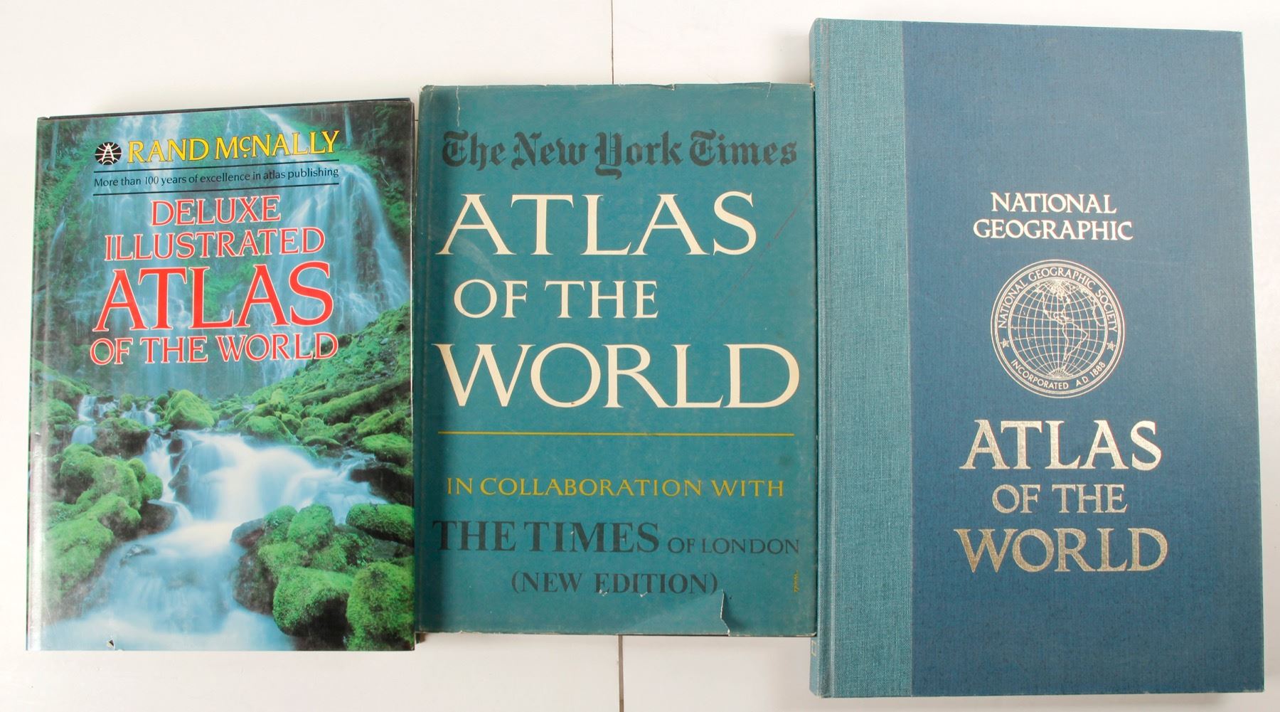 Three large format atlases. Atlas of the World, New York Times, 1978, DJ; Deluxe Illustrated Atlas of the World, Rand McNally, 1989, DJ; National Geographic Atlas of the World, 1981, no DJ. State: City: Date: