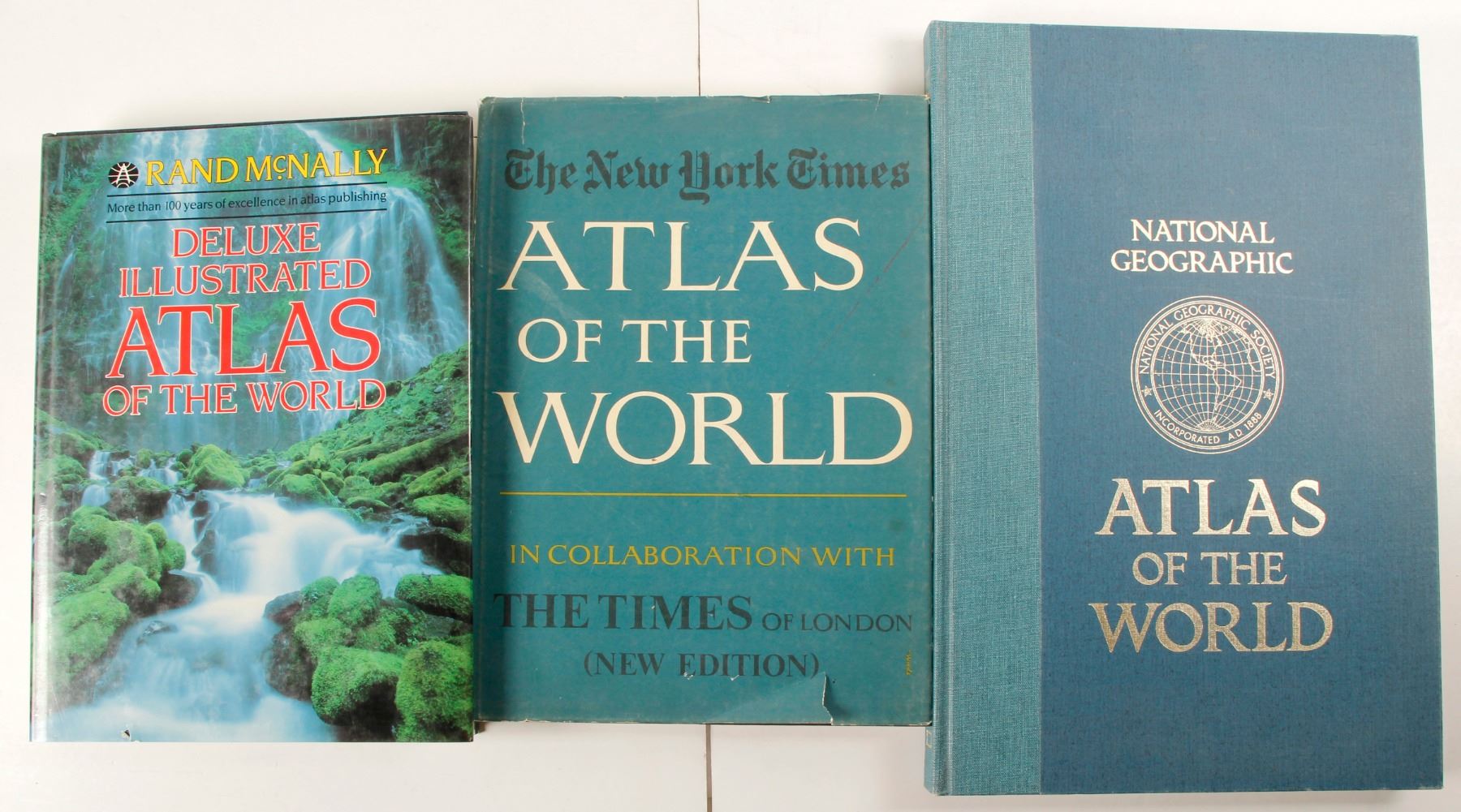 Three large format atlases. Atlas of the World, New York Times, 1978, DJ; Deluxe Illustrated Atlas of the World, Rand McNally, 1989, DJ; National Geographic Atlas of the World, 1981, no DJ.
