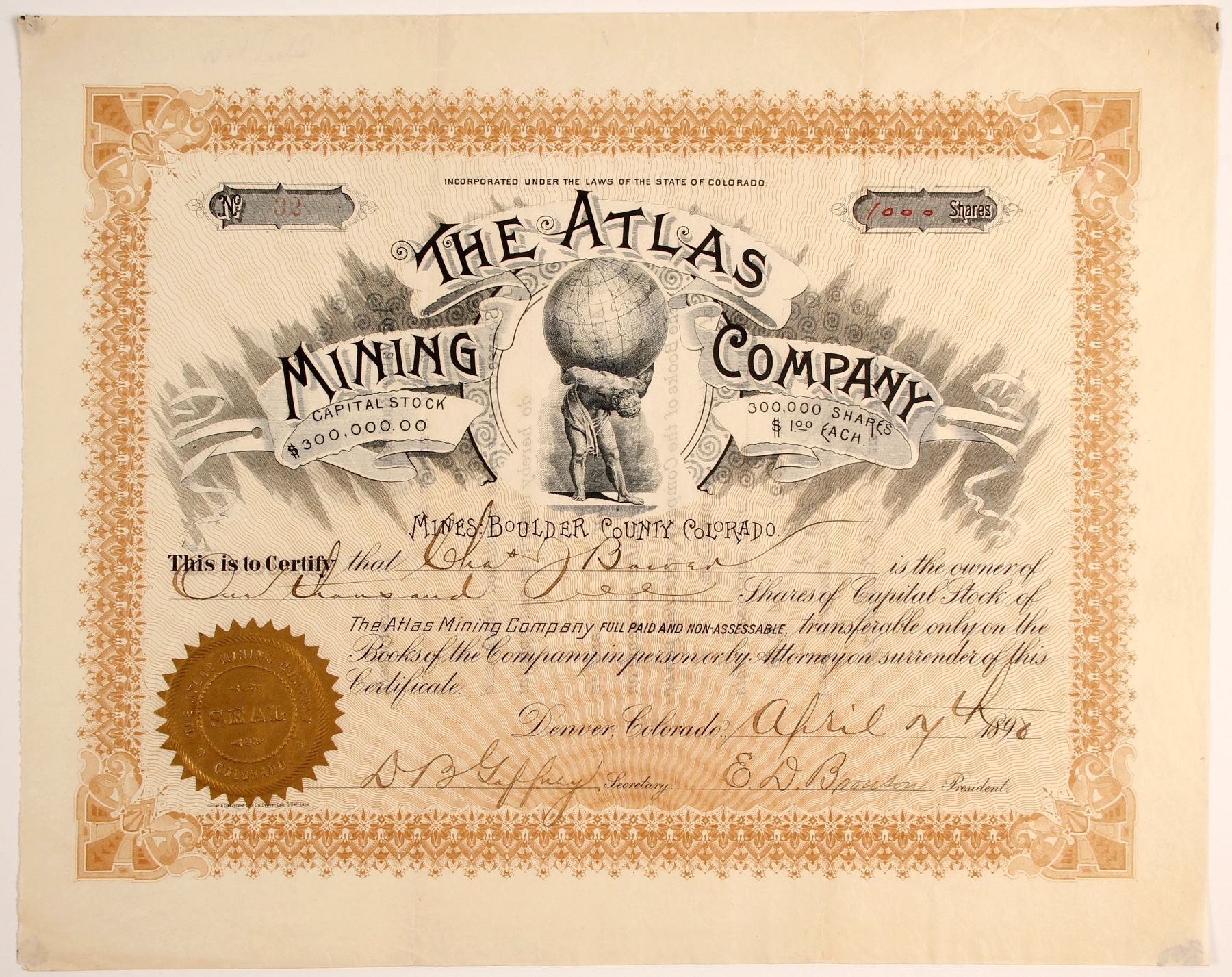 # 32 for 1000 shares to Charles Bower. Datelined Denver 1890. Signed by Secretary DB Gaffney and president ED Bronson. Gold Seal. Printer not mentioned. Not cancelled. Overall in very nice condition (corner folds, slight edge rips at folds). "Mines: Boulder County Colorado." Atlas holding up the world vignette. Gold seal. In 1894 Bronson, et al, incorporated the Bronson Patent Placer Mining Machinery Company in Denver, Colorado. Prag Collection City: Boulder County State: Colorado Date: 1890 HWAC# 79747