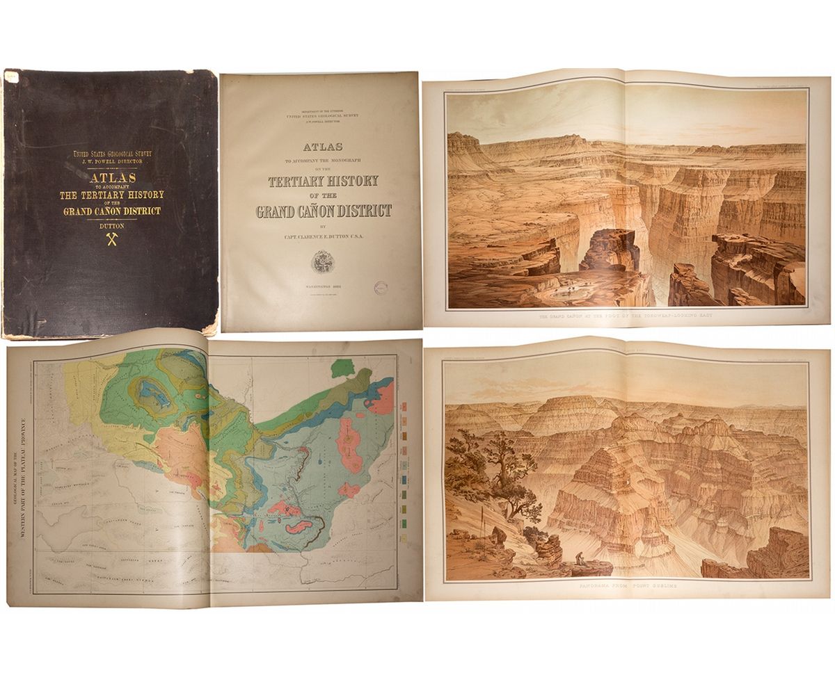 Clarence Dutton. 18.5 x 21.5". Front board loose. Lacking spine cloth. Edge wear. x-library. 23 atlas sheets. Beautiful colored atlas sheets of geology and duotone sketches of parts of the Grand Canyon. This is one of the most famous of all USGS Monographs, introducing the Grand Canyon in large format maps, sketches and sections .City: County: State: AZDate: 1882