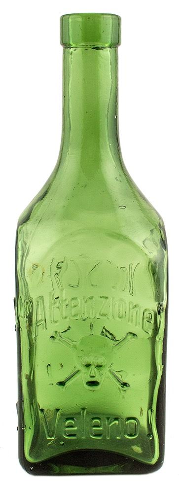 Light green poison bottle with skull and crossbones embossed on three panels. Vorsicht! Gift! Attenzione! Veleno! Poison! Attentions! Poison! 9" tall 3” square.