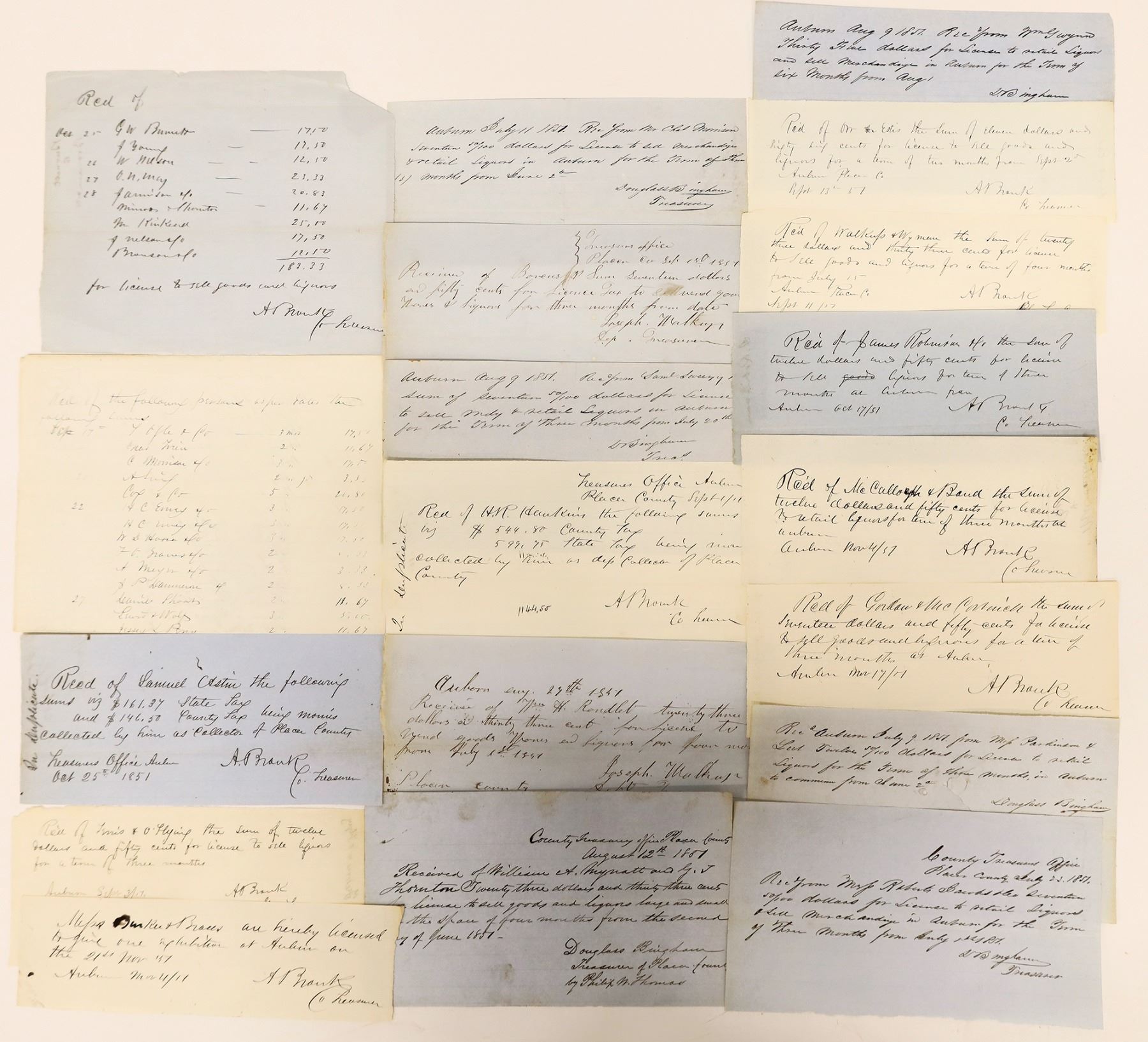 About 15 small hand written Auburn mostly liquor licenses, c. 1851. A few tax receipts mixed in. Some on blue paper. Auburn California