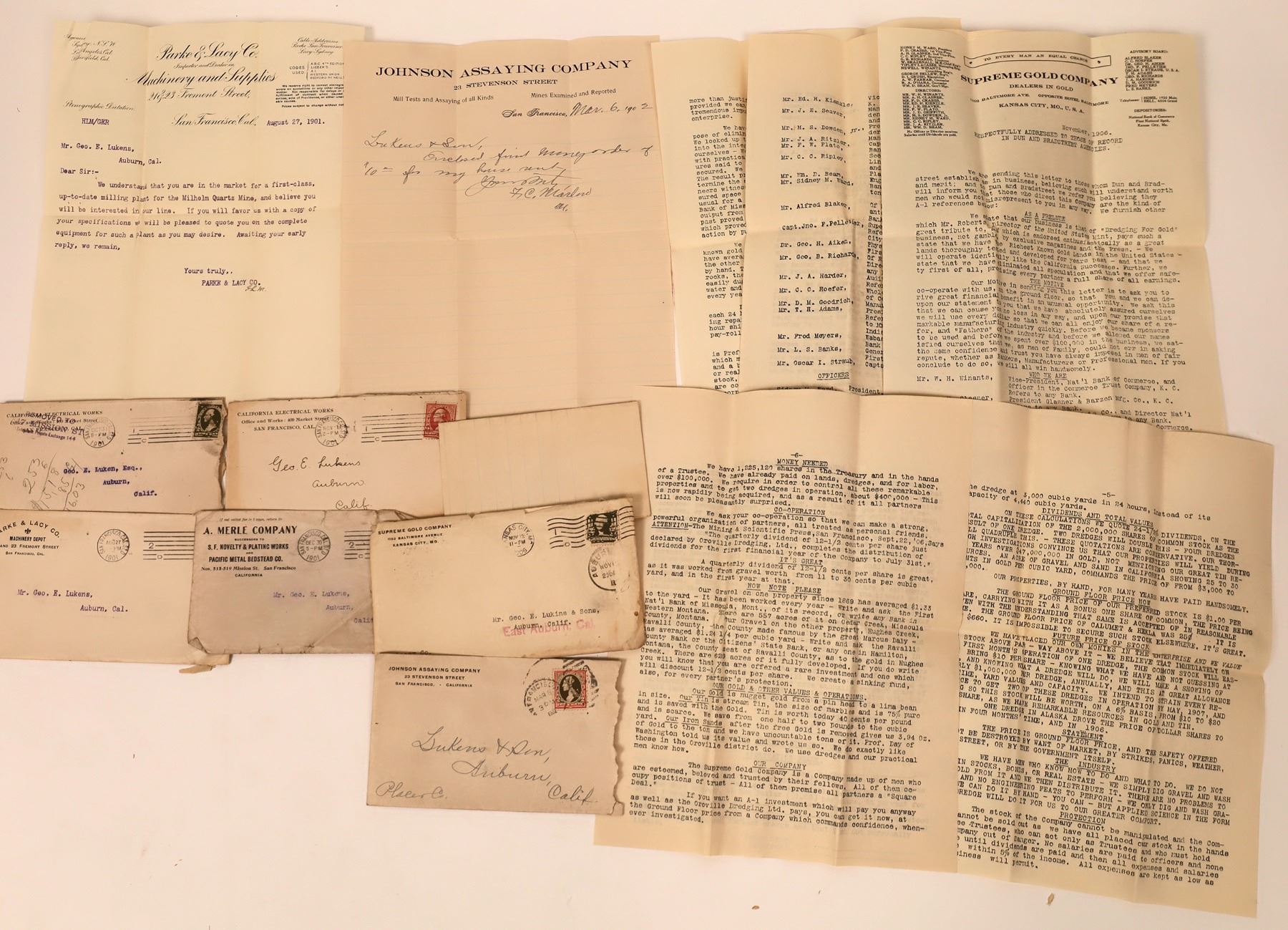 Small group of correspondence related to mining and mining supply companies doing business with GE Lukens in Auburn Ca. Includes park, Lacy; Cal Electric; Johnson Assaying; Supreme Gold. Covers and contents.