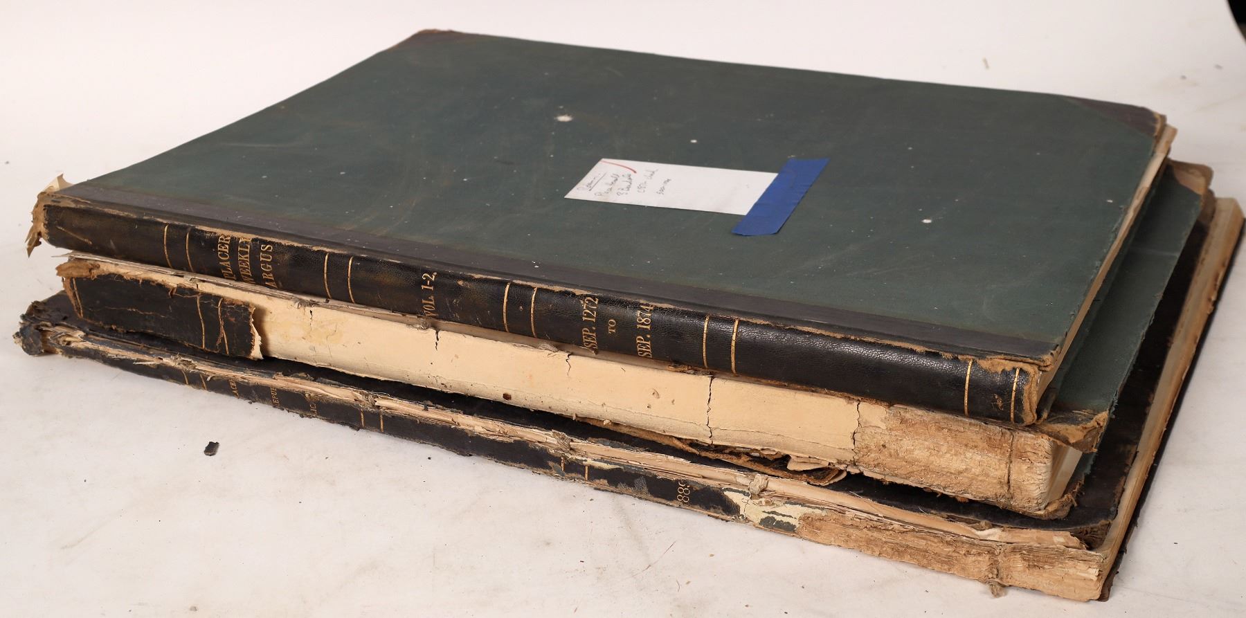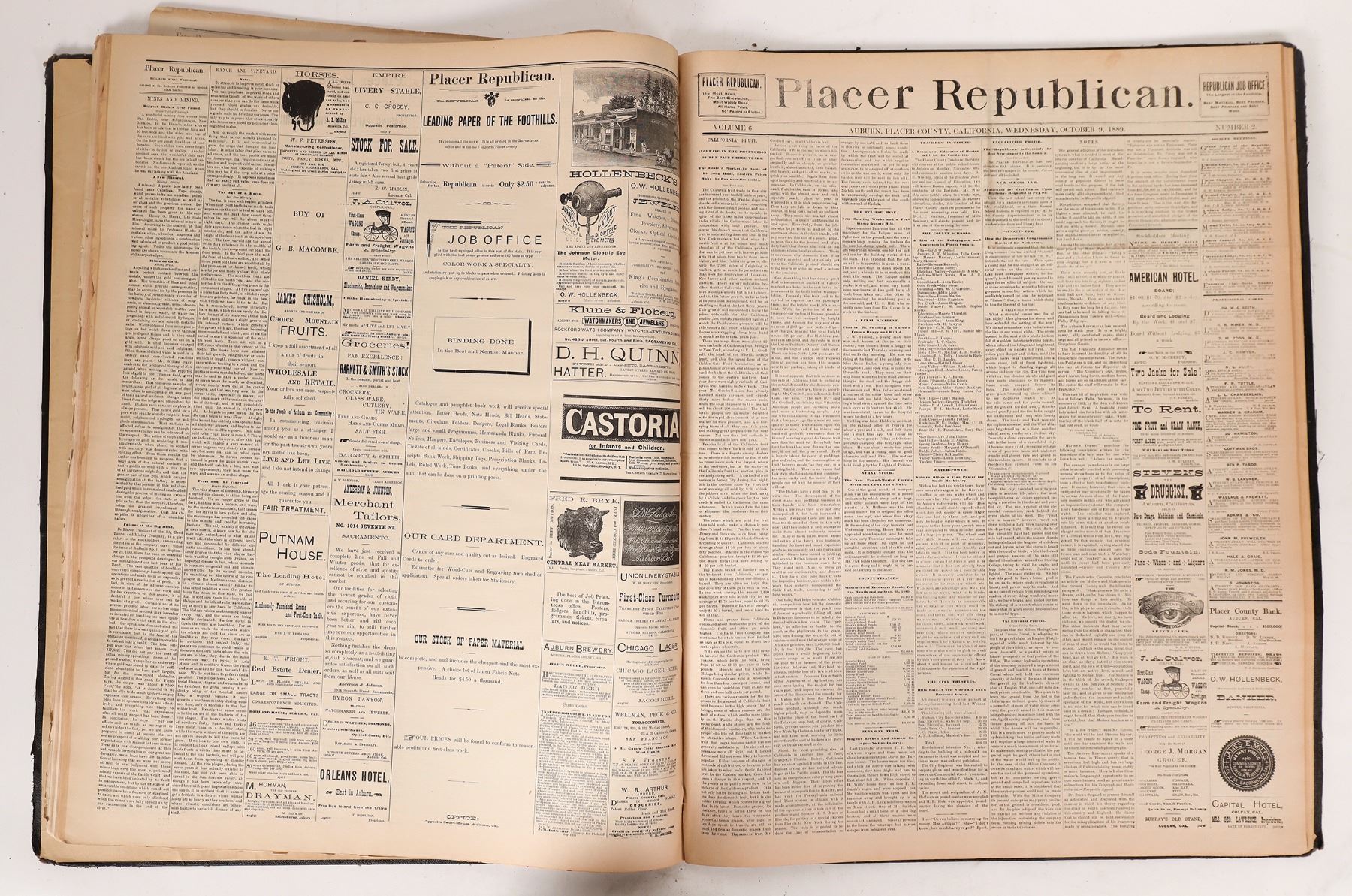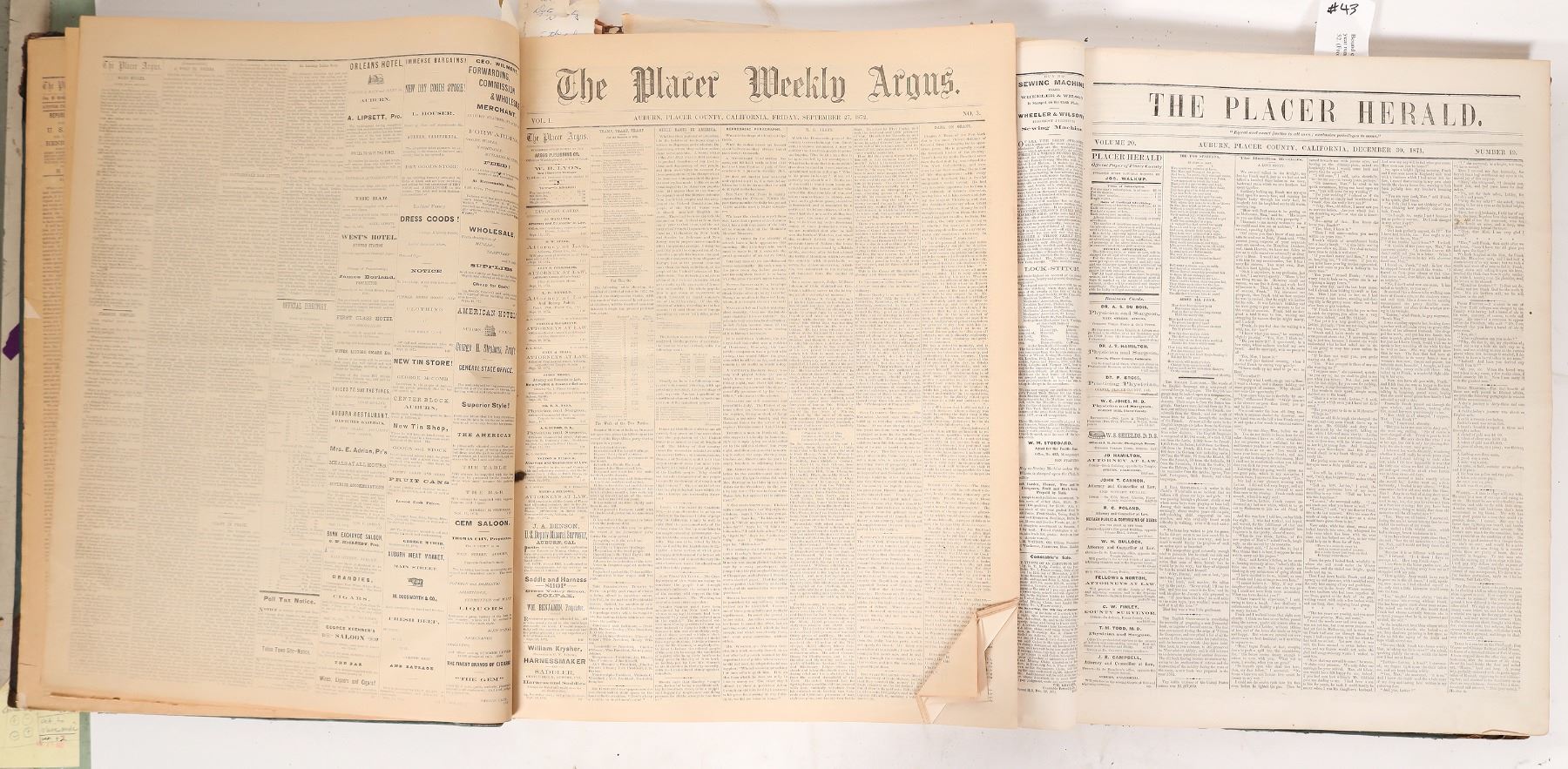 Three large bound volumes of three Placer County newspaper archives. This includes 1871 editions of The Placer Herald (1855-1991), The The Placer Weekly Argus (1872-1874) These include the entire two year run of the paper. Lastly, we have The Placer County Republican (188? to 1???). These are the 1889 editions. The hardbound volumes need repair, but all the pages are intact. This is a time that the country was divided and the newspapers reflected that divide. Please see photos for more details. Auburn California