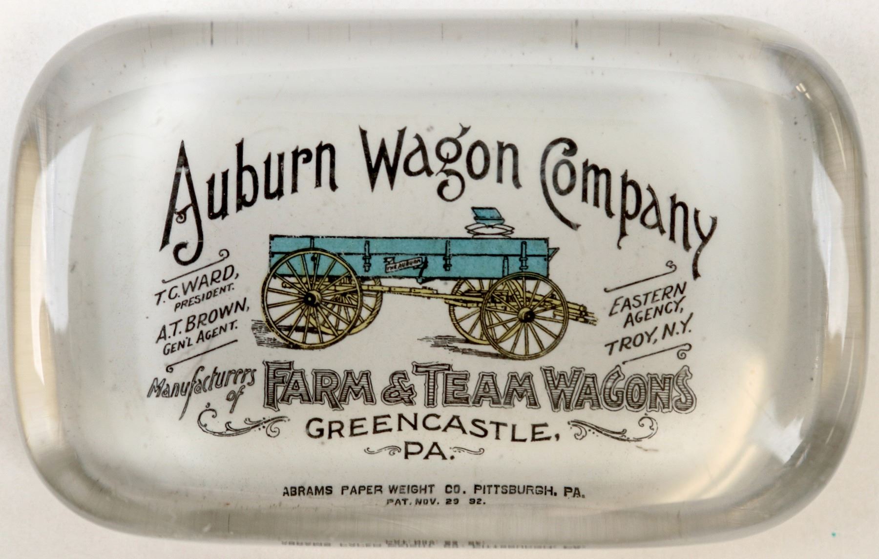 Glass paperweight, 4 x 2 1/2 inches, 3/4 of an inch tall, advertising the Auburn Wagon Company, Farm & Team wagons from Greencastle, PA.