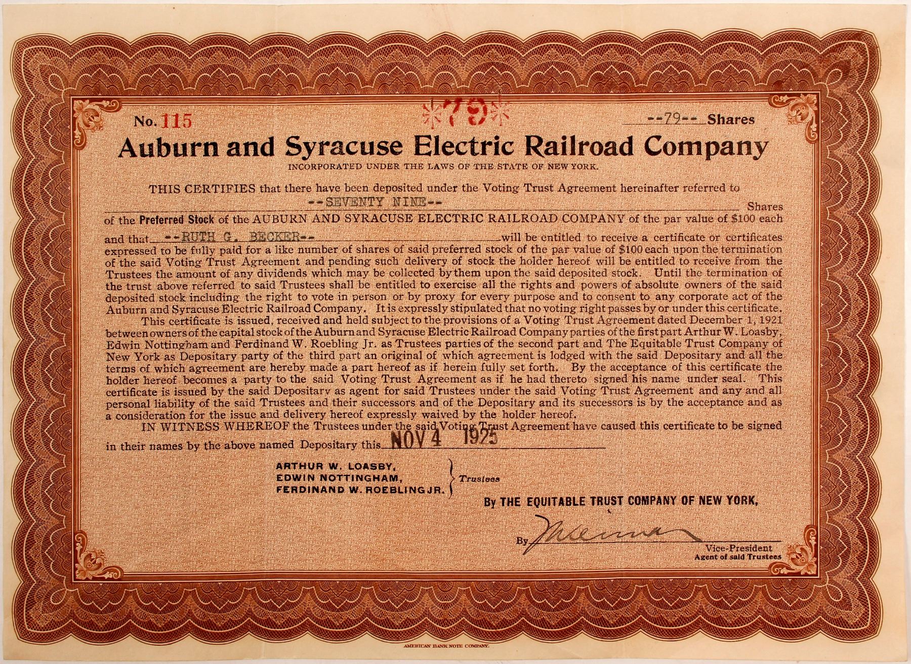 79 shares of Auburn and Syracuse Electric Railroad Co cert. #115, signed Nov. 4, 1925 issued to Ruth G. Becker. Auburn and Syracuse Electric Railroad ran from Auburn to Syracuse, NY covering 24 miles. Road owned by Clifford D. Beebe of Syracuse. The Beebe Syndicate controlled lines that ran from Rochester to Syracuse, to Auburn to Oswego on Lake Ontario. Company declared bankruptcy in 1927 and streetcar service in Auburn ended. Rail service was abandoned on Apr. 15, 1930. Printed: American Bank Note Co. Prag collection.