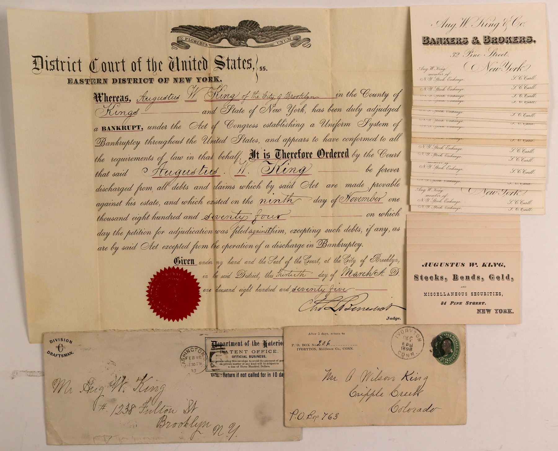 Lot of 31. King went from banking in New York to mining interests in Cripple Creek and Nevada. His name appears in other pieces from the Heizer Estate. Lot includes an 1875 Eastern District of New York bankruptcy certificate for King, which we've never seen! Also includes: 28 business cards, two different types; and two covers addressed to King (one when he is in Cripple Creek).Heizer Estate
