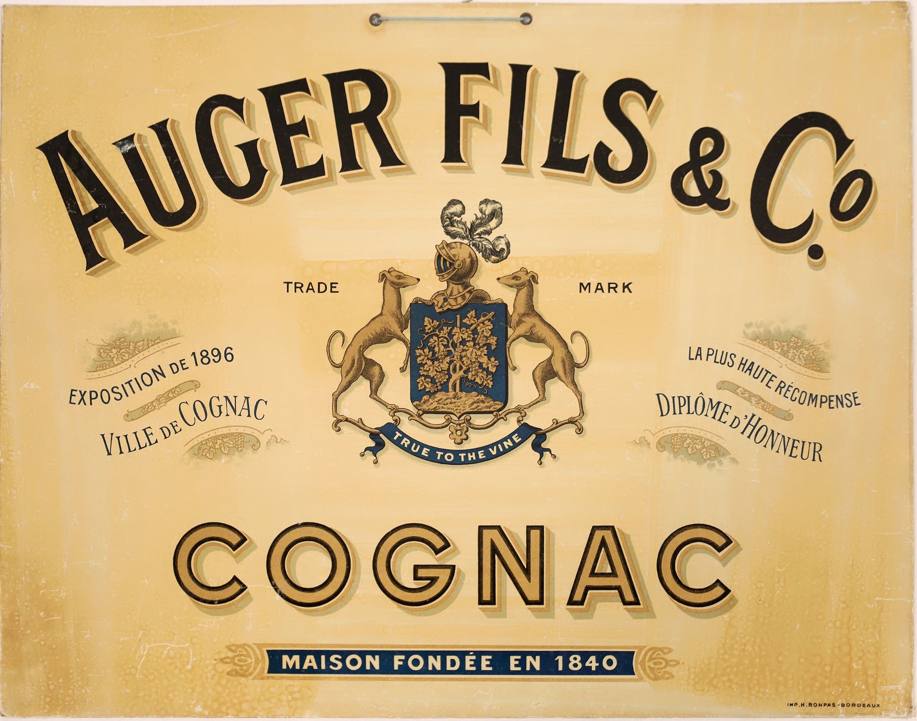 This Cognac advertisement for Auger Fils & Co. is gold tone paper on card stock printed in Bordeaux France 17.5 inches X 14 inches some corner wear.