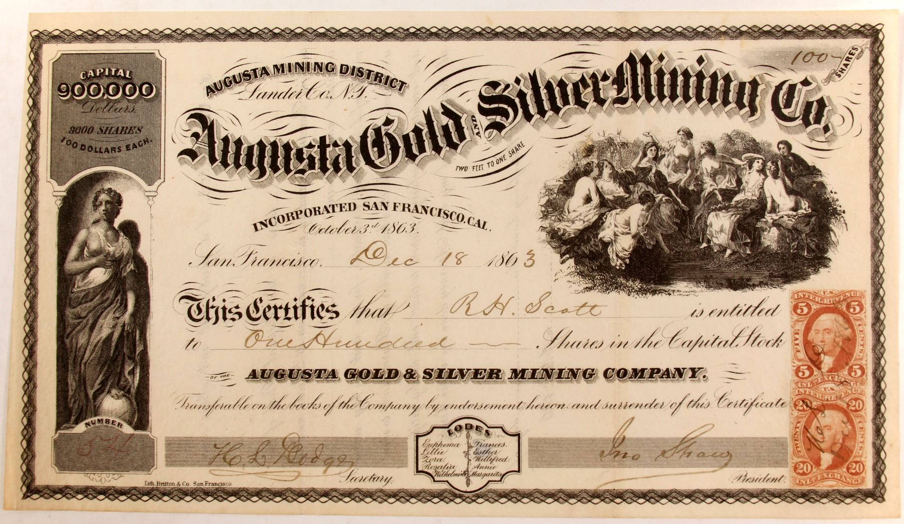 This is a mine named for a mining district with a great vignette and list fo ten lodes to match the vignette. # 54 for 100 shares to RH Scott. Signed by HL Dodge and John Shaw. Dateline San Francisco, December 18, 1863. Incorporated October 1863. Location: Augusta Mining District, Lander Co., N. T. Lodes are listed: Euphoma, Lillie, Zora, Rosalie, Wilhelmina, Frances, Esther, Willifred, Annke and Margarita. Vignette shows ten ladies (as in the names?) mostly semi-nude. Not cancelled. Small 5c and 20c revenue stamps. Britton & Co. printer. Two folds. No edge, corner or pinhole issues. Todd and Welton (1866) placed the historic Augusta district in this area, east of the present Bernice district. The General Land Office map (1866) shows the Augusta district to cover most of the central Clan Alpine Mountains, including Augusta Canyon and the present Tungsten Mountain district. The Tungsten Mountain district extends north into Humboldt County, covering the mountains along county line, north of the Augusta Mountains and east of Humboldt Salt Marsh. [Nevada Mining Districts by Tingley] Prag Collection