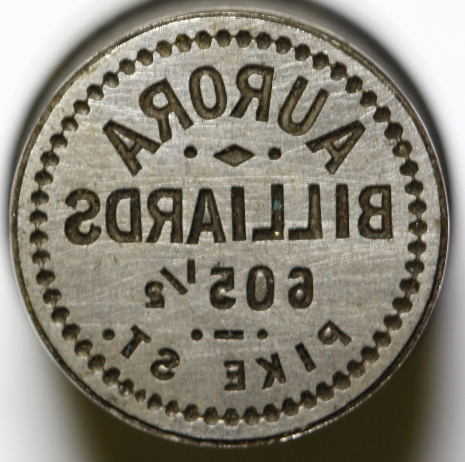 19 mm. Aurora / Billiards / 605 1/2 / Pike St. NWT Mint Historic Die Collection. State: Oregon City: Aurora Date: HWAC# 86345