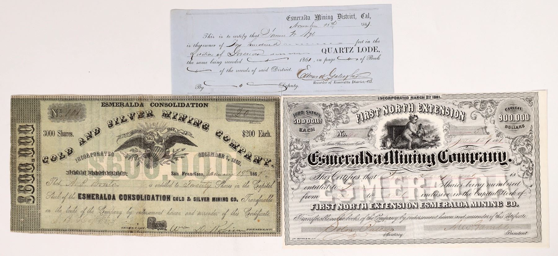 Choice stock certificates from three difference Aurora mining companies from very early on. Includes: 1) Governor Quartz Lode Stock, Territorial Governor Nye. Quartz Lode claim for 200 feet to Governor James W Nye in the Esmeralda Mining District. 1861. A search by the holder believes this is a fantasy piece: can't find mention of the recorder, book number not included, page number not included, etc. Still Governor Nye was actively infused in the Esmeralda district and this would have been right up his alley. 2) Esmeralda Consolidated G&S Stock; Rare and Early Nevada Territory Stock. Incorporated December 1, 1860. Very early! #101 for 20 shares to A. P. Bouton on January 19, 1861 in San Francisco. Signed by S. B. Hopkins as secretary and William D. Robinson as president. Not cancelled. Shows some discoloration and wear. Eagle with shield vignette proudly announcing, Incorporated 1860. 1860 stock certificates are very rare! Black on green with white box underprint $600,000. Fancy design border. No printer. The Daily Alta California on May 20, 1863 confirms this company was located in the Esmeralda District (Aurora). This cert comes with the earliest references to the Esmeralda Mining District [a rich lode has been discovered that assayed at $4,200 to the ton] and the mining camp of Aurora [There are currently seventy-five houses of various grades occupied by about 450 inhabitants]. 3) First North Extension Esmeralda Mining Co. Stock Certificate. An incredibly early 1861 issued Aurora stock! Inc. March 2nd, 1861. No. 90, issued for 5 shares to Isaac Kirkpatrick on July 15th, 1861 in San Francisco. Signed by Alex. Gamble, president, and Solon Pattee. Not cancelled. Beautiful design by Britton & Co. Grey background, fancy logo, vignette of child with dog. Fold, extremely fine. 5.25 x 9.25" Pattee was the secretary for a number of Aurora mines, including the Wide West. Gamble is listed in the SF directory as being in the mining business. Gamble was a very successful merchant in Big Oak Flat, California during the Gold Rush. He took that money and became a mining speculator and investor. His brother Peter and he were founders of the immensely successful Wide West Mine on Last Chance Hill. They sold their stock at a great profit and bought Real Del Monte stock cheap. Within a few months it had risen to $500 a share and Gamble was a millionaire. Not too long after that Governor R. K. Colcord of Nevada in his memoirs of territorial Aurora noted that he had fallen into poverty, "...his shirt was unlaundered and he was living in a two-bit restaurant." Clemens never mentioned this mine and its activity is unknown. The original district was ten miles square and named by M.J. Corey, one of the three original discovers in the summer of 1860. James Braly, E.R. Hicks, and Corey were camped at Esmeralda Hill when Hicks went out to shoot some game for breakfast. He noticed quartz outcrops, and brought back chunks to camp. They tested them for quartz and gold. The first claim was the Old Winnemucca Ledge, located August 25, 1860. The first mill was built in June 1861. Within a year, there were ten mills.