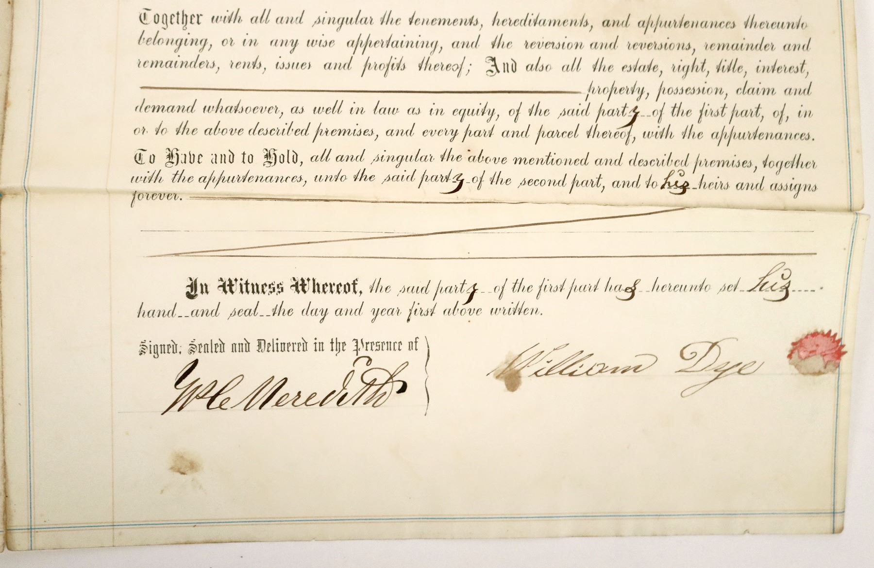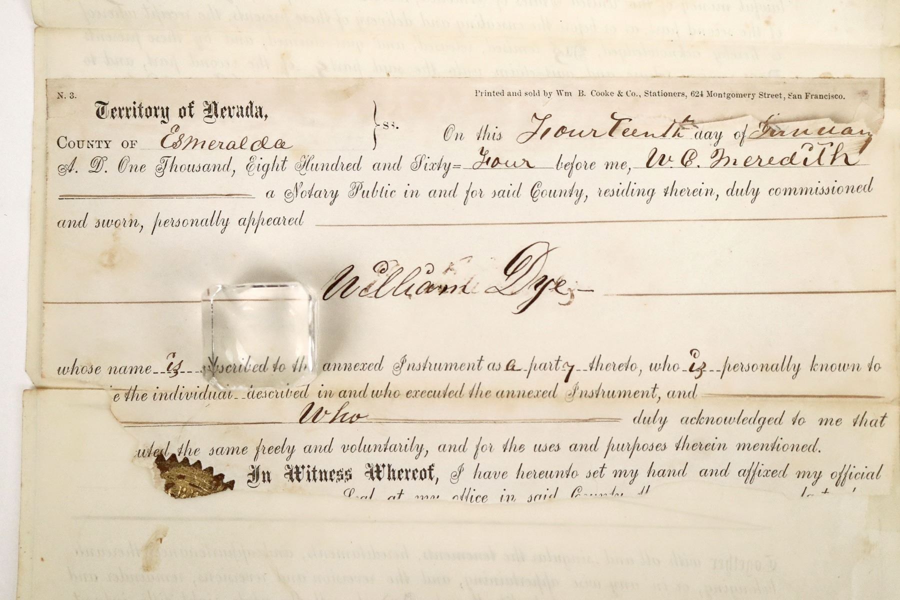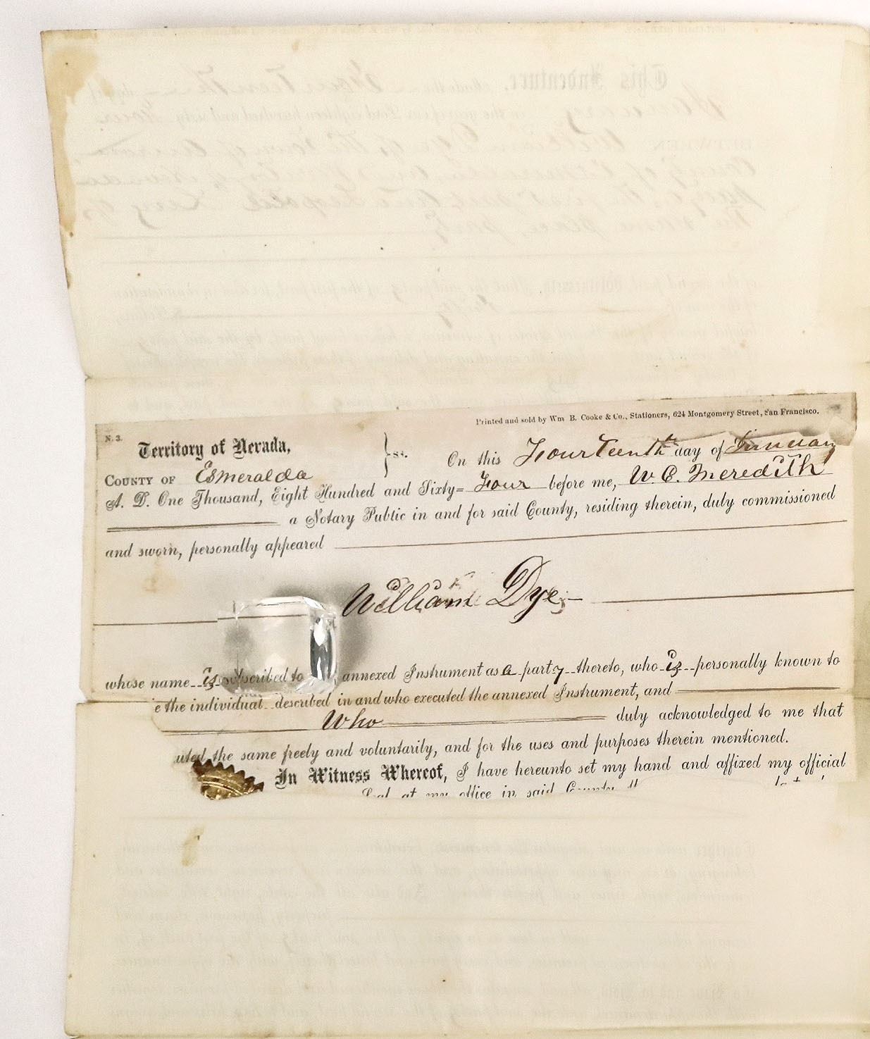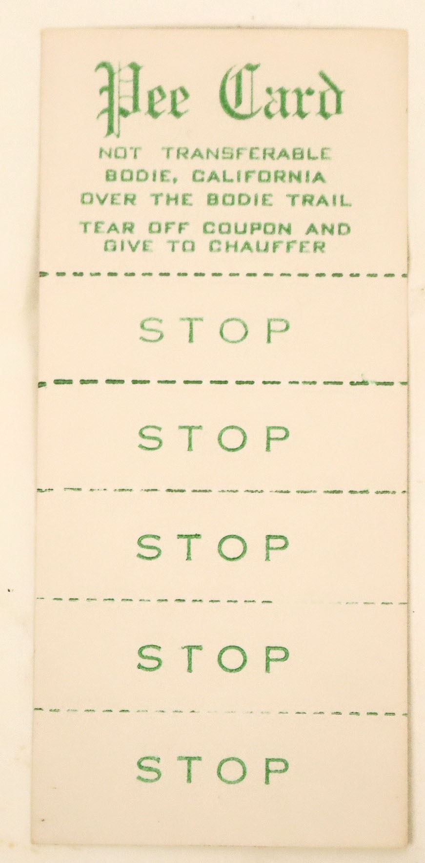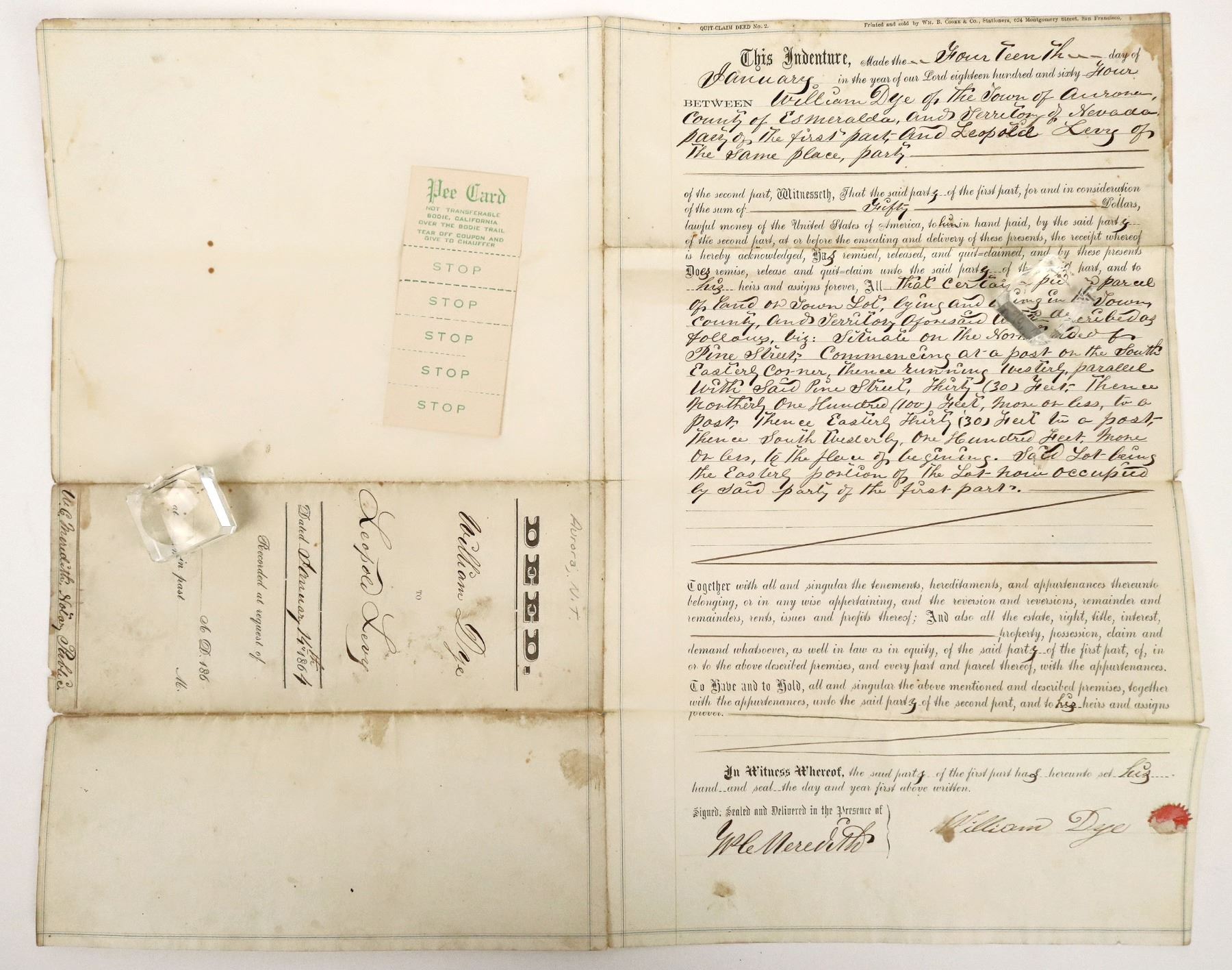 1) 1864 city lot deed, Aurora, N. T. between William Dye and Leopold Levy. Property on Pine Street in Aurora. This was just around 2 years after Mark Twain had been prospecting in Aurora. Aurora was just coming down off of its boom and had a population of 5-6,000. Gold had been discovered in nearby Bodie, but that rush wouldn't take place for another 15 years. 2)Probable fantasy Bodie Pee Card from early 20th century automobile tours.