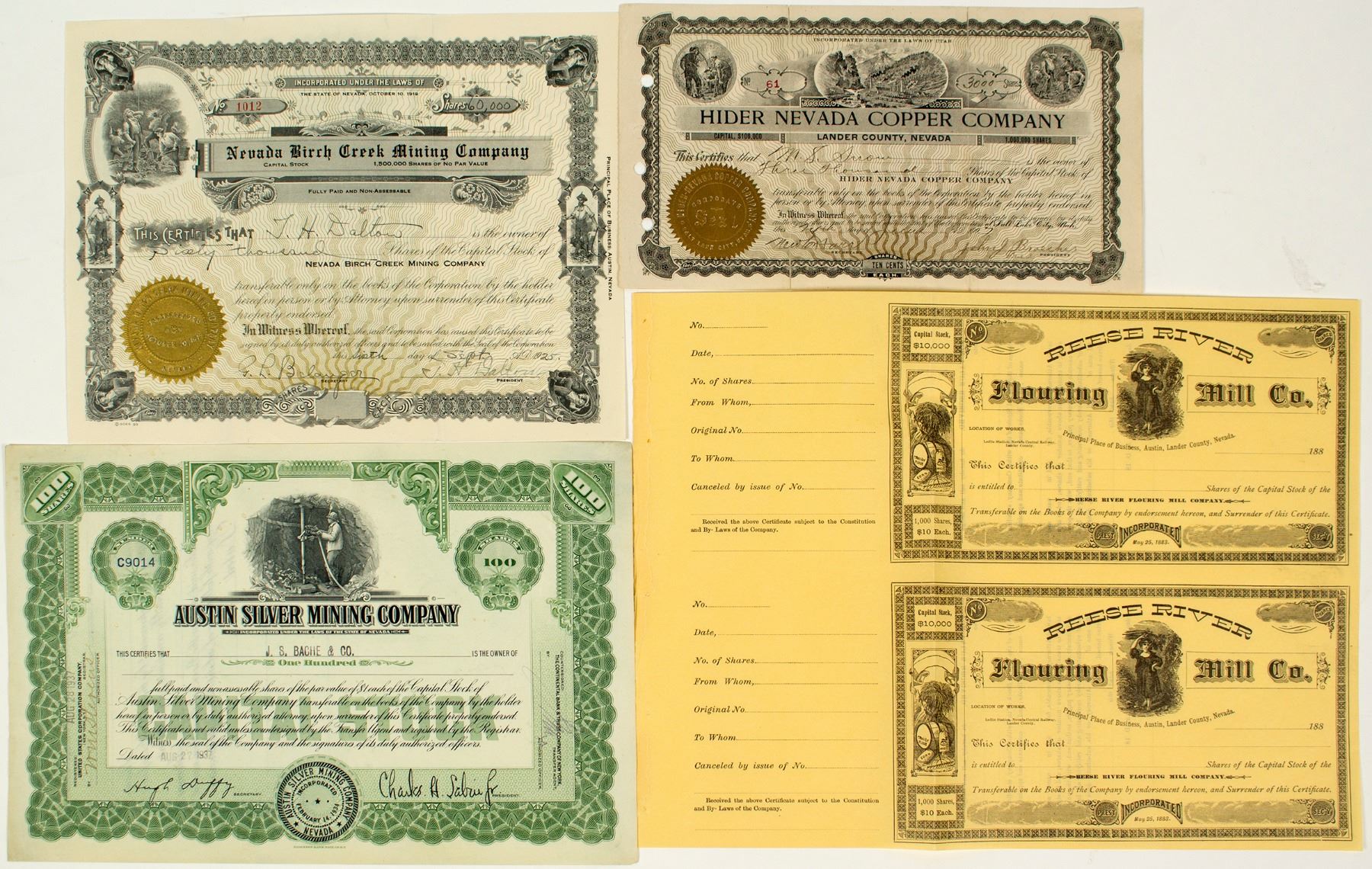 Lot of 4. Included: 1) Hider Nevada Copper Company (Lander County). No. 61, issued for 3,000 shares in 1907. Punch cancelled. Three mining vignettes. Folds with separation. 2) Nevada Birch Creek Mining Company. No. 1012, issued for 60,000 shares! to the company president, T.H. Dalton in 1925. Not cancelled. Multiple mining vignettes. Folds. 3) Austin Silver Mining Company. No. C9014, issued for 100 shares in 1937. Not cancelled. Miner with drill vignette. Some staining. 4) Sheet of two unissued Reese River Flouring Mill Company stocks circa 1880s. State: Nevada City: Austin Date: 1880s-1937 HWAC# 42171