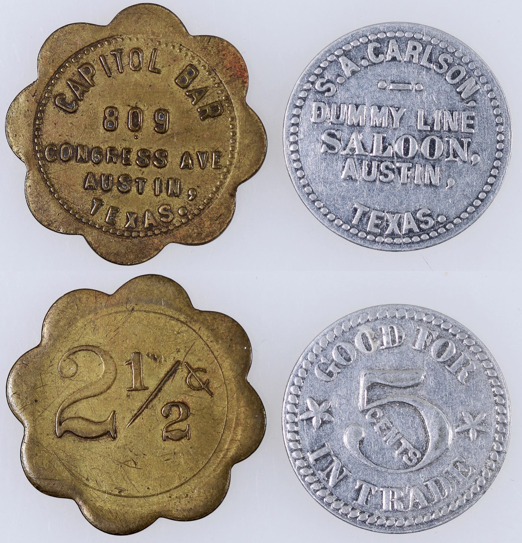 GOOD FOR / 5 CENTS / IN TRADE; Al., rd., 25 mm. 2) CAPITOL BAR / 809 / CONGRESS AVE / AUSTIN, / TEXAS. // 2Ω¢; Br., Sc 8, 29 mm.
