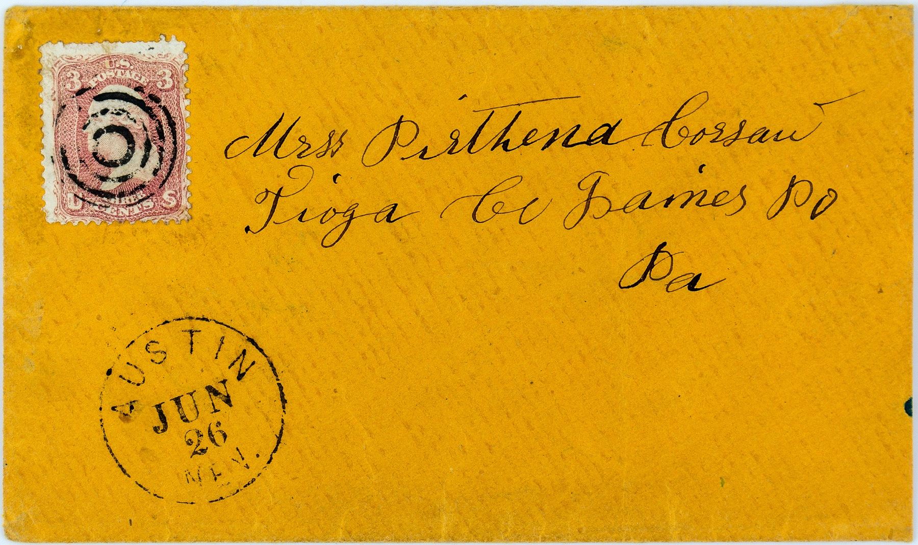 June 20, Austin, Nev. cancel. But James Gamett makes a strong case that this is really an N. T. cancel. His argument is included. State: Nevada City: Austin HWAC#: 46686 Date: 1864