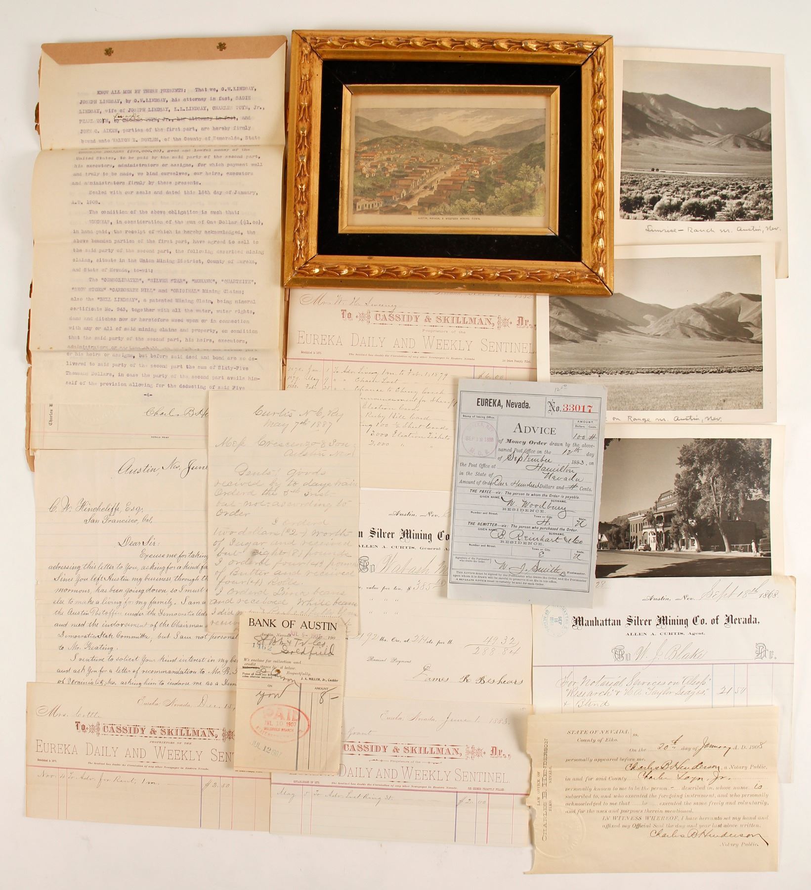 Billheads from Eureka Daily and Weekly Sentinel 1881-83, letter to CW Hinchcliff asking for a political favor, Austin and Eureka city street photo prints, mining claim sale doc, 1908 notary, Manhattan Silver Mining billhead 1868 and receipt. framed color print of Austin, print 4.5x6.5" City: Austin/Eureka State: Nevada Date: