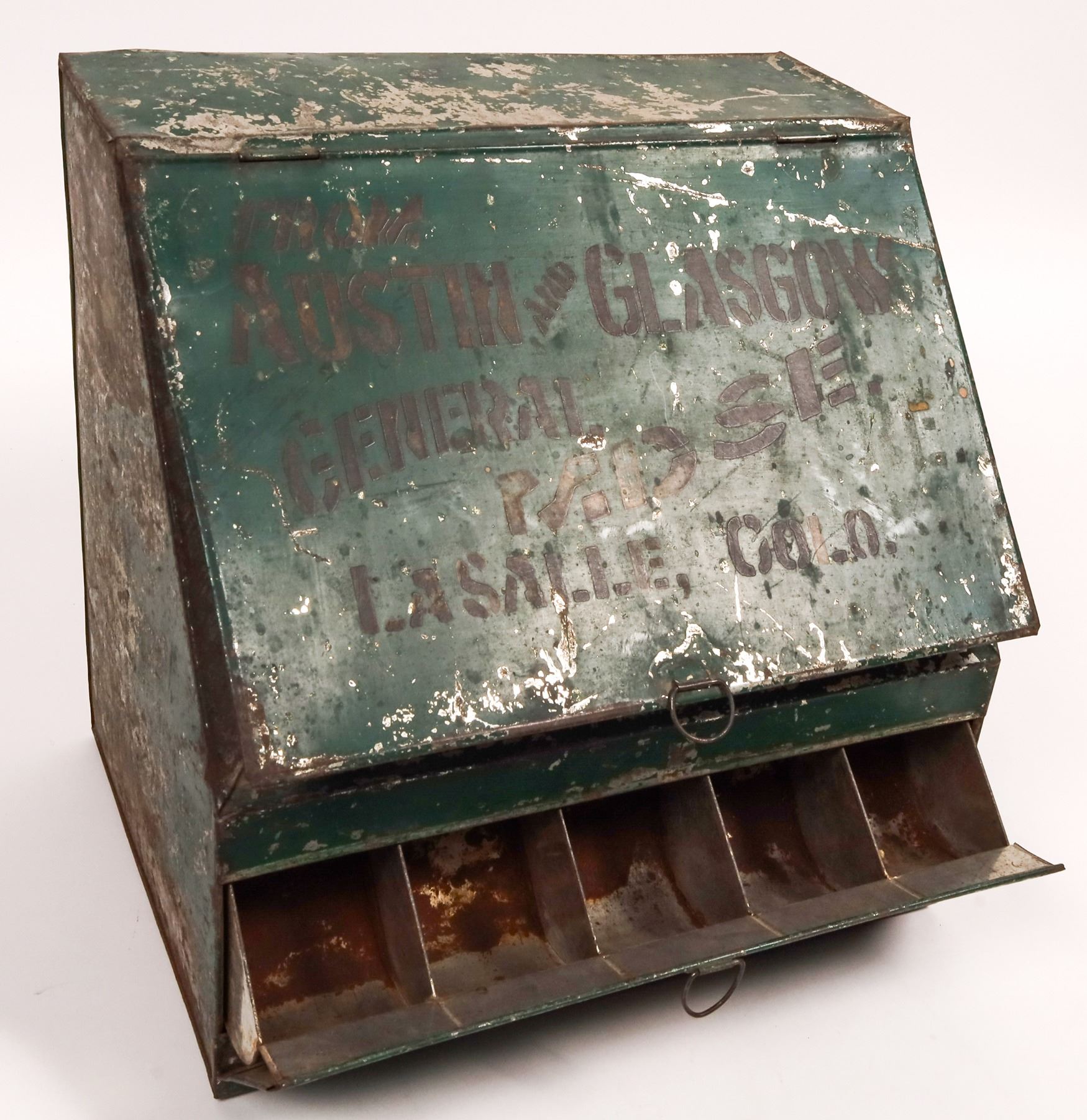 Sheet metal, green painted, merchant vending box from Austin & Glascow/General Mdse./Lasalle, Colo./Spices. Hinged upper lid, lower hinged spice 5 tray compartment. 12.75x12.75x9.5". Rust along back bottom, some paint flaked off, 1 rear hanger loop missing.