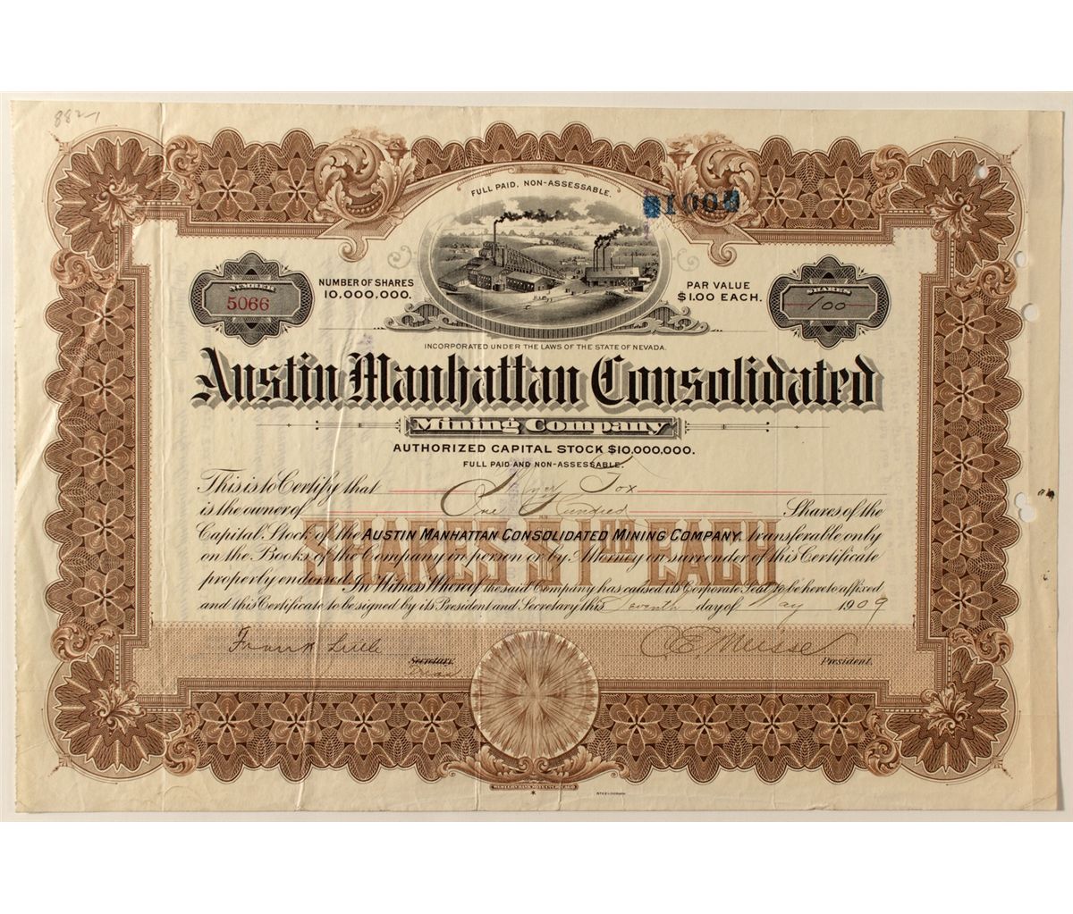 #5066 FOR 100 SHARES TO Myer Fox. Signed by Frank Little and C. E. Meise. Oversized at 14x9 _î. Cancelled. Small vignette of Mill and mine. Stamped on the bottom is a statement to the affect that ïpurchaser is getting stock at a very low price and agrees not to sell or transfer the stock. Excellent condition. Date 1909 Austin, NV hwac 20455