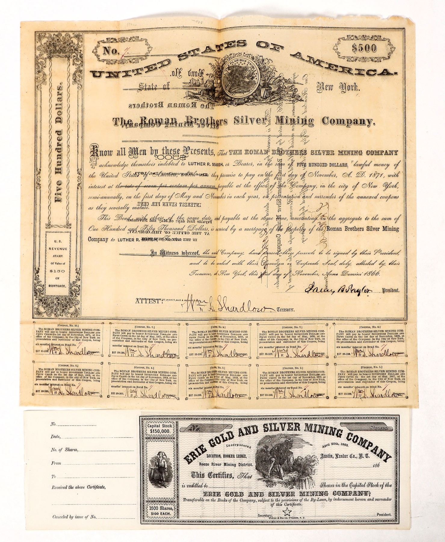 Unissued stock-Erie Gold and Silver Mining. Bond-1866 Roman Brothers Silver Mining with 10 coupons with some upper right degradation. Unusual transparent paper. Not listed in Raymond. According to an 1867 New York court case, the mining property was located near Austin. The company's two ledges of silver ore were called the Romulus and the Remus (hence the company's name).