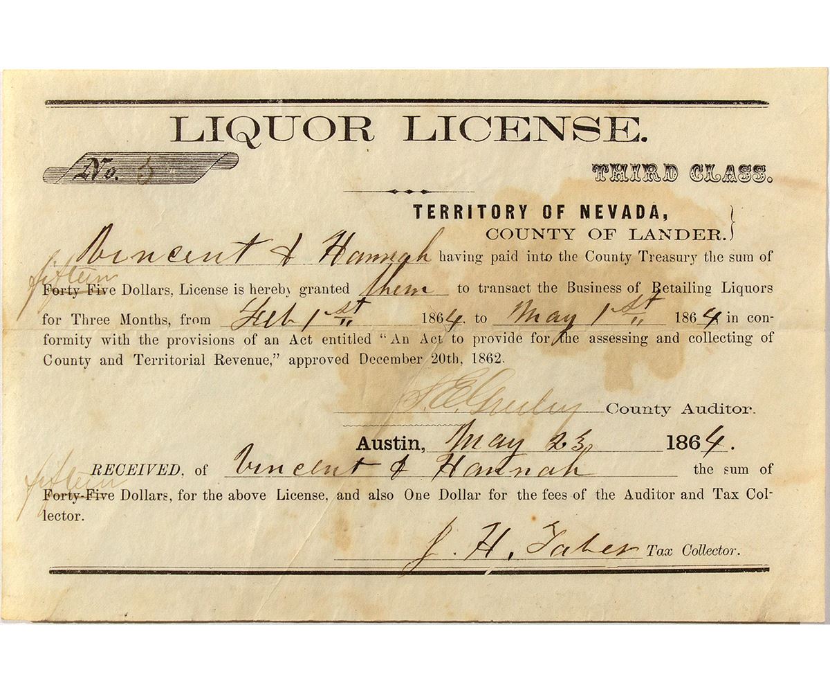 This liquor license was issued on May 1, 1864 exactly six months before Nevada was to become a state. It was issued to Duncan & Hannah. Duncan most assuredly is in reference to John Duncan - one of Austin's early and most famous businessmen/bankers. One of the interesting things about this license is that the cost was fifteen dollars. That number is handwritten and 'forty-five' has been crossed out. Was the camp already experiencing a decline in profit?