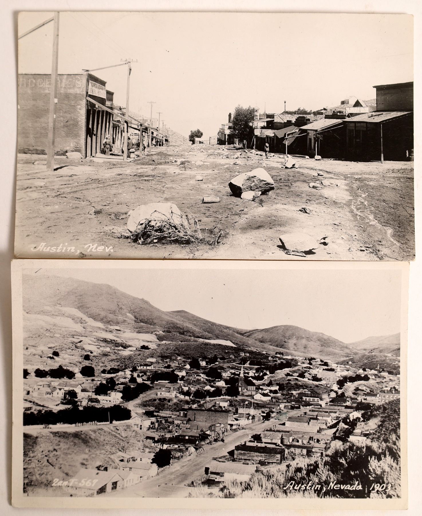 Lot of two real photo postcards of Austin, Nevada. Birdseye view, 1903, postmarked 1949; and Main Street when it still had boulders in the road. Used in the Holabird bottle book.