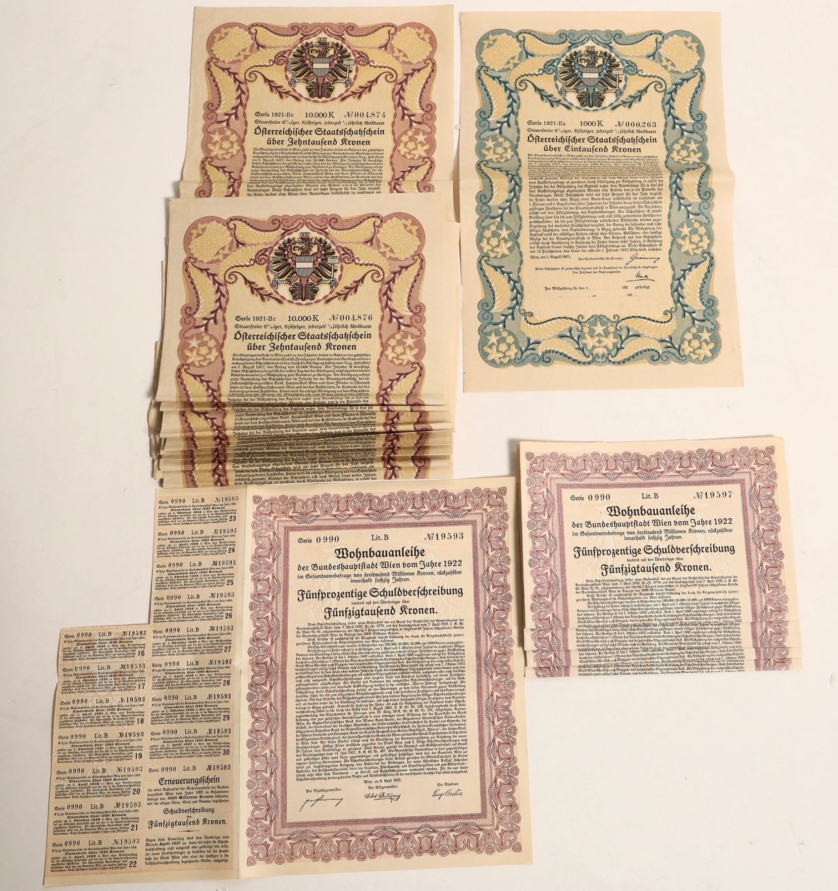 Lot of 15. Housing, war and State loan bearer bond of the German-Austrian Gov't. Ornate borders, double and single eagle head coat of arms eeither as a vignette or underprint, some have coupons attached. All U/U. Excellent cond.