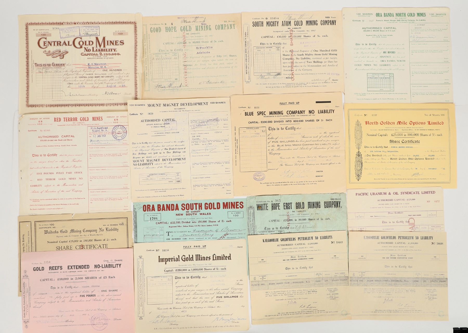 Group of 38 stock certificates from Australian mining and petroleum companies, containing stocks from 25 different companies with 13 duplicates; see photo for names of all companies represented. The stocks date from 1920 to 1956. All issued, all appear uncancelled. All issued in Pounds, Shillings, and Sixpence currency denominations. Certificates vary significantly in condition, see photos for details.