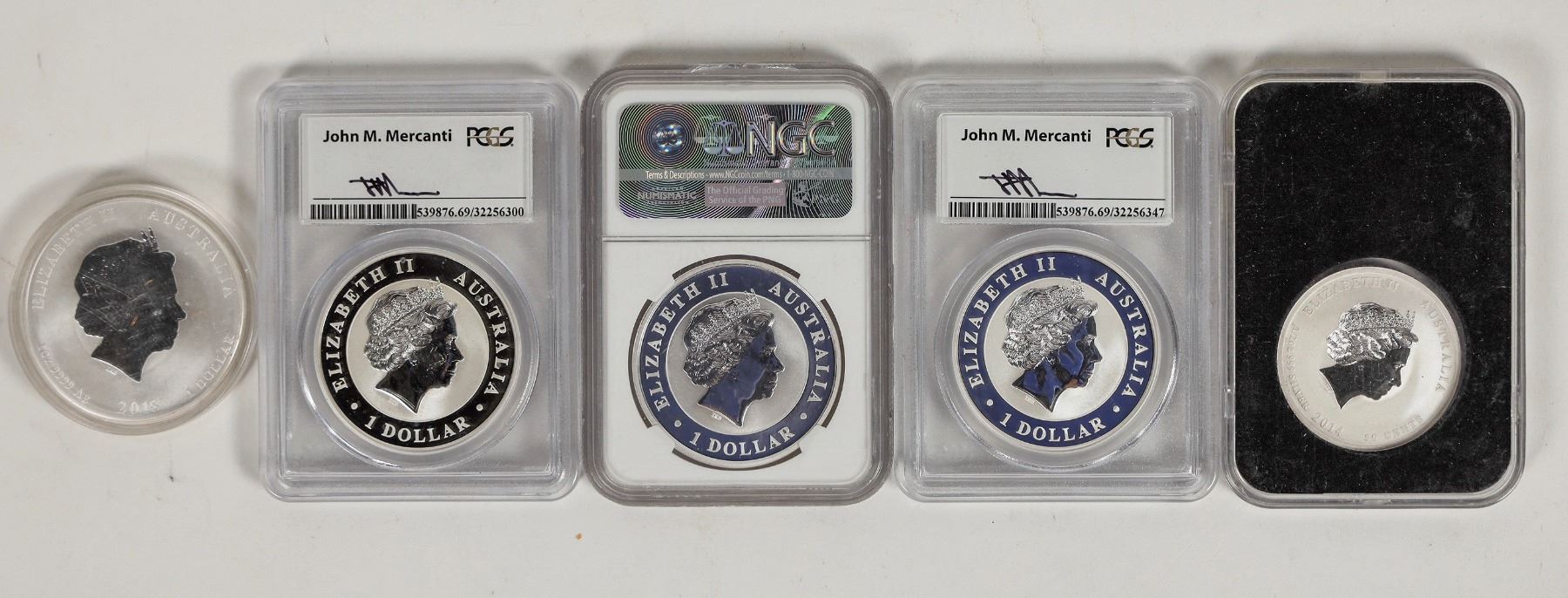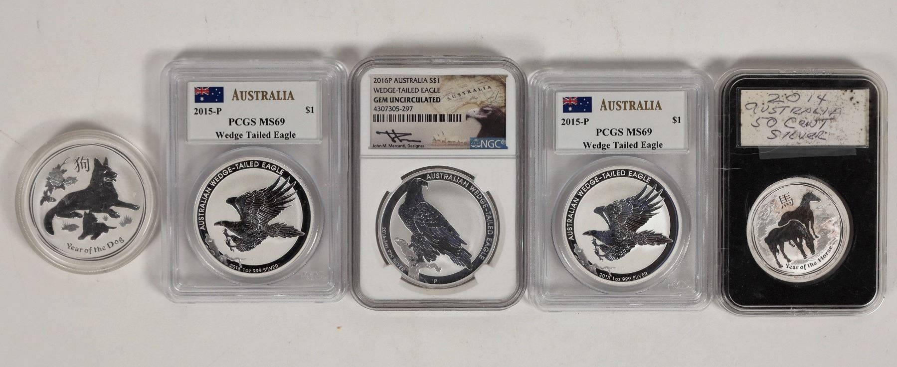Five Australian silver bullion coins: four one ounce: 2015-P Wedge Tailed Eagle (2 PCGS MS 69); 2016-P Wedge Tailed Eagle (NGC Gem Uncirculated); 2018 Year of the Dog. Also 2014 fifty cent Year of the Horse 1/2 ounce silver.