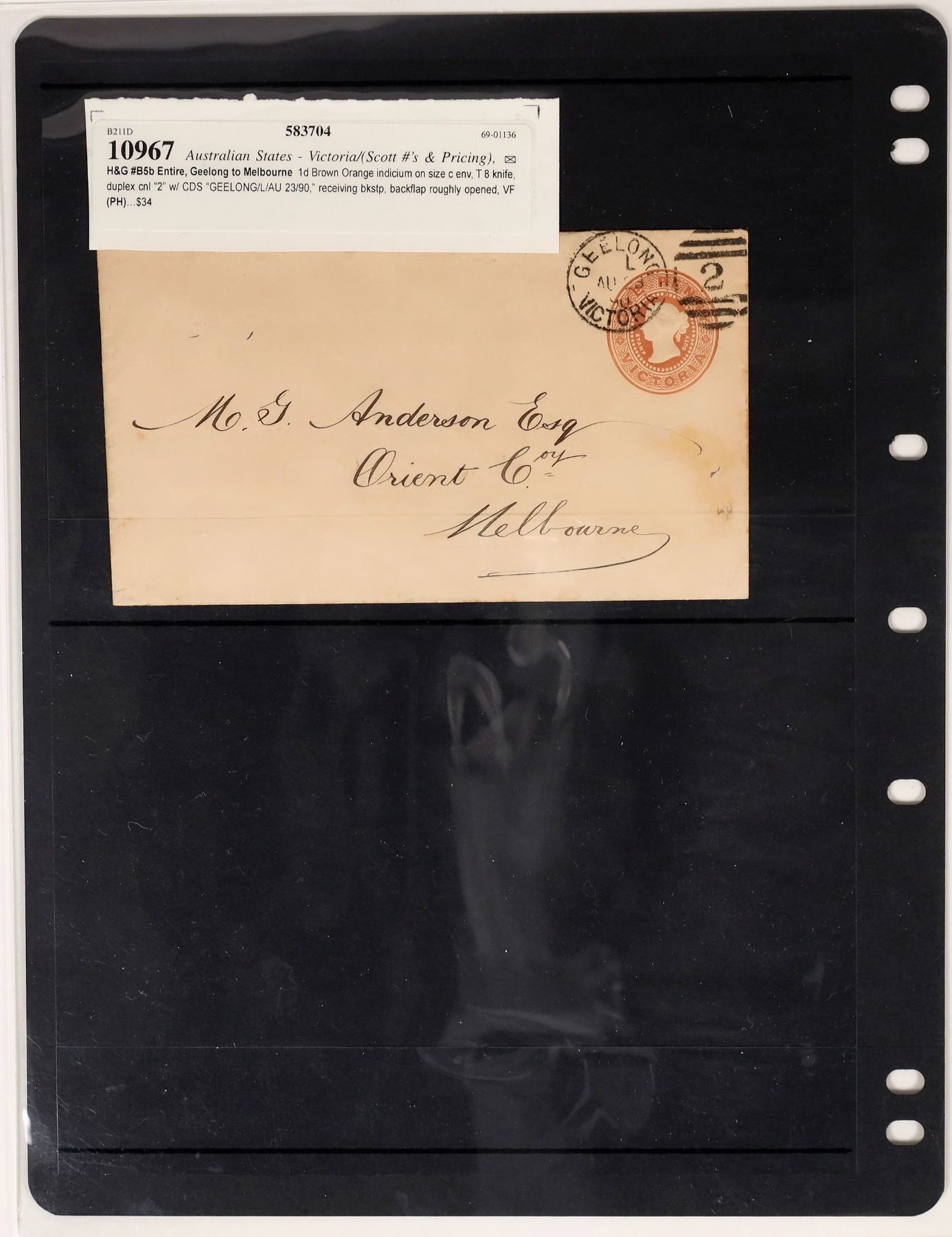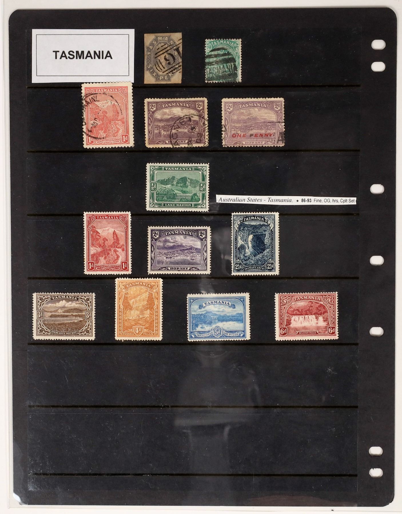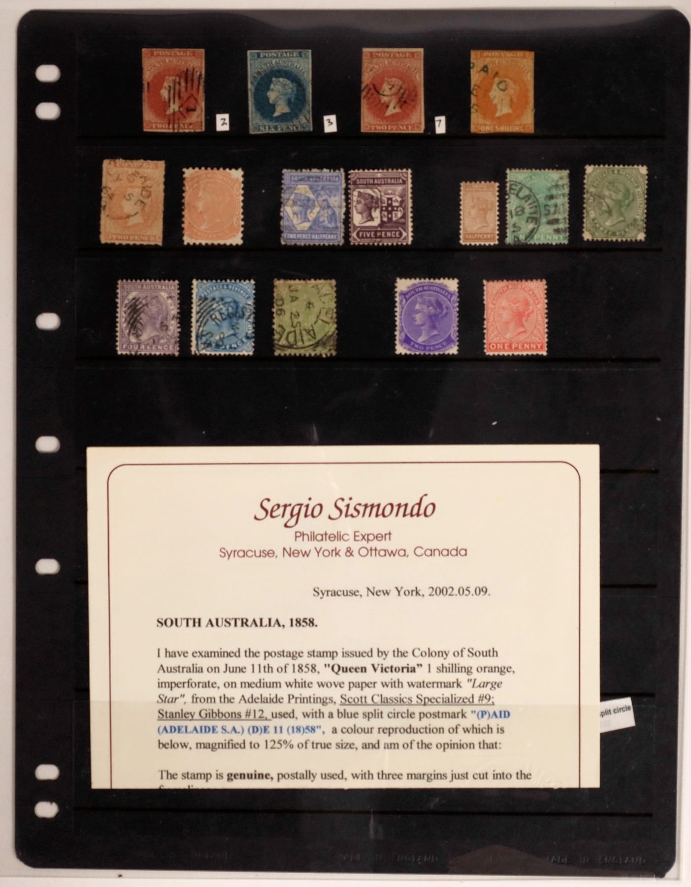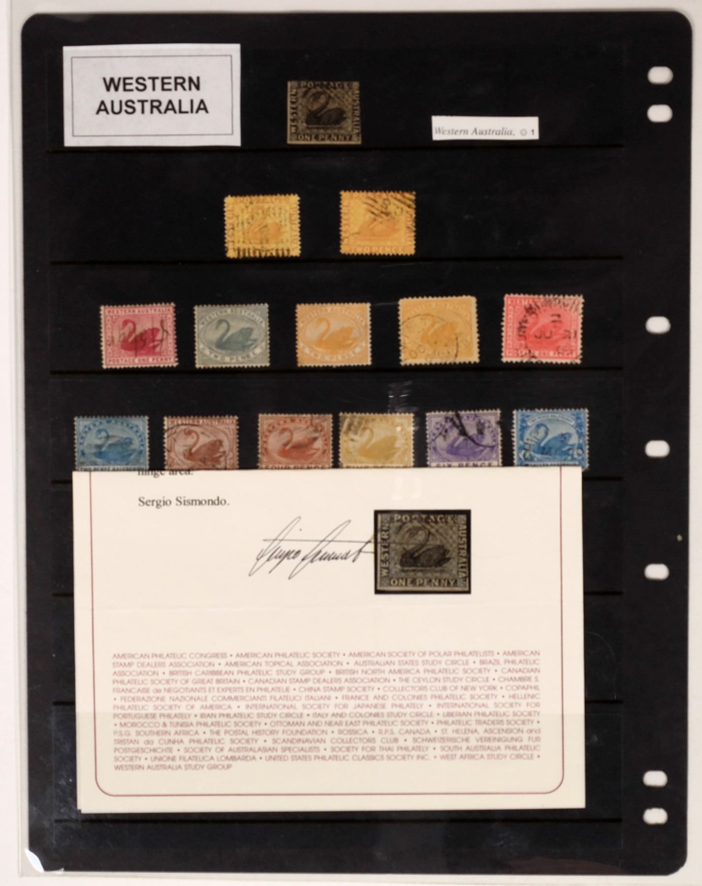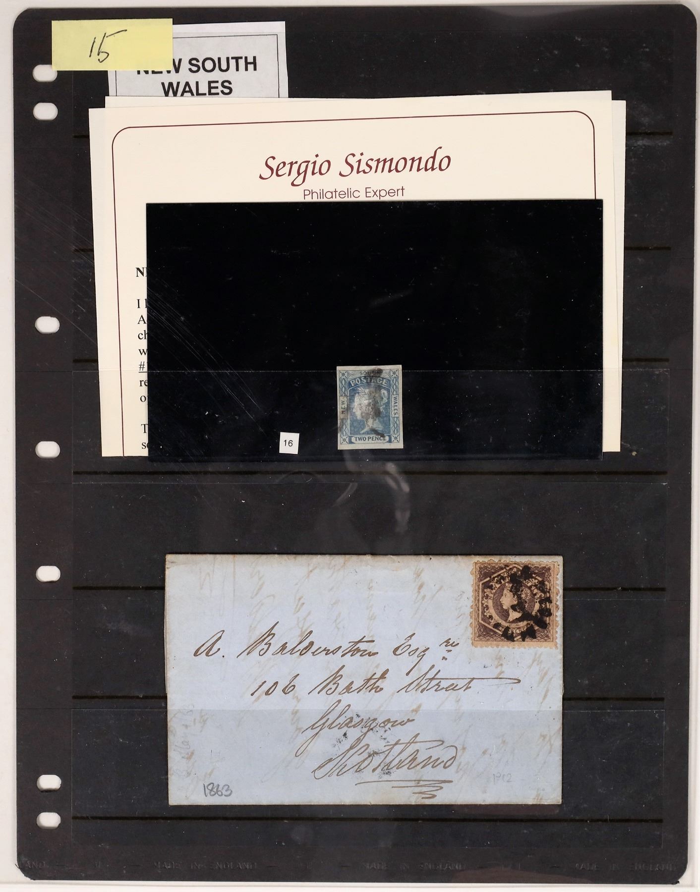Australian States. Mixed group incl. New South Wales 1851 2p (Scott #14c, Sisimondo certificate, good margins but small thins), Registration imperf, and 1863 cover to Scotland with 6p; Queensland (owner's 2005 Scott $615, noted 1868 1p orange); South Australia ($720, noted 1858 1p orange with Sisimondo certificate); Tasmania ($190, incl. 1899 Pictorial set mint); Western Australia (incl. 1854 Black Swan 1p, two margins, Sisimondo certificate); Victoria incl. early 1855 regis cover with 1s blue (x2) plus Regis. 1s blue & rose, soiling, and 1861 cover to Demararra British Guiana with Half Length rouletted 6p, 1860 4p & 1p (#30, 51, 59, all faulty), cover with tone spots, still a rare destination.