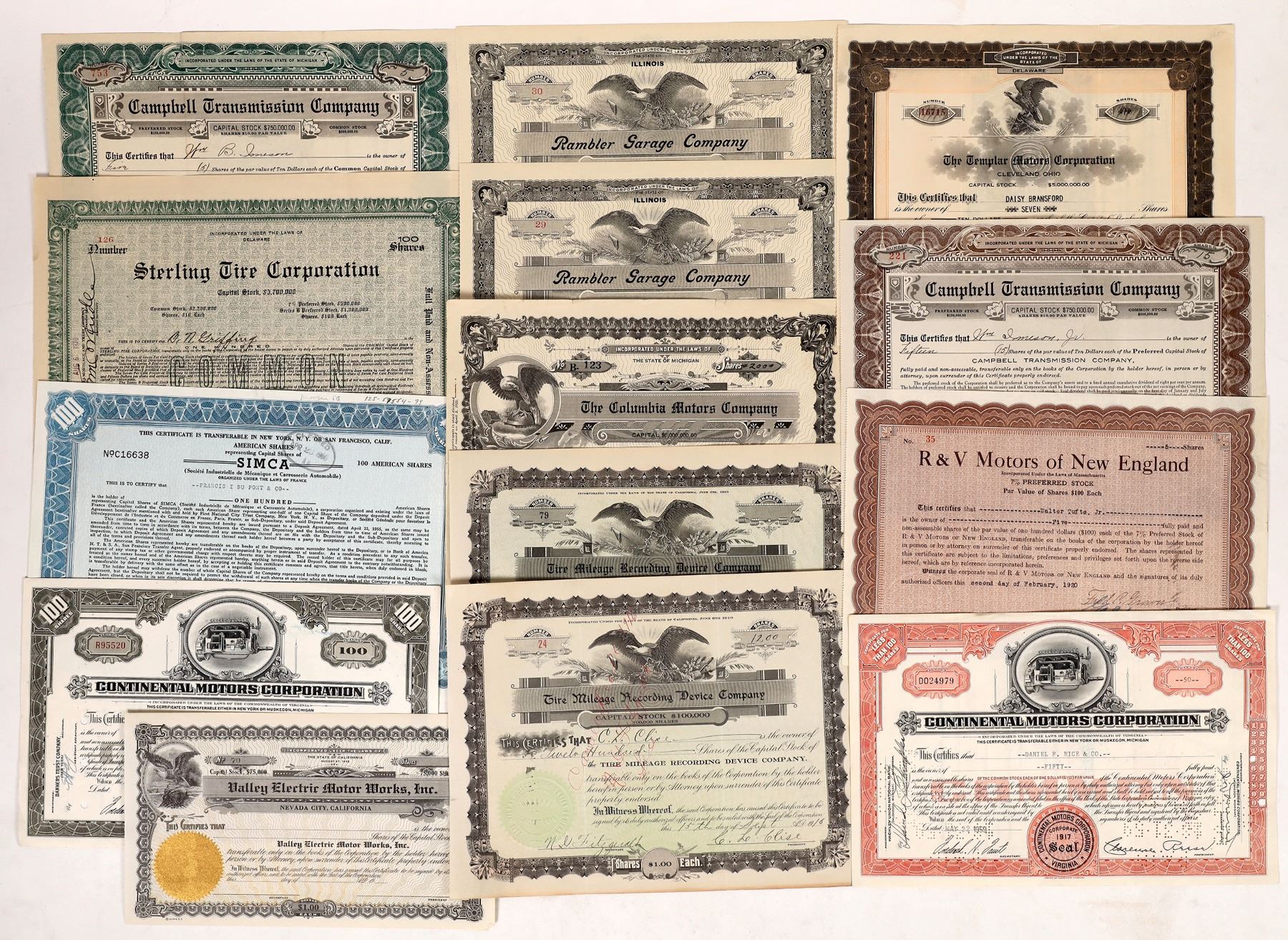 A collection of 14 stock certs related to the Auto Equipment industry, c1916-59. Some dupes. See photo(s) for more details. Ken Prag Collection