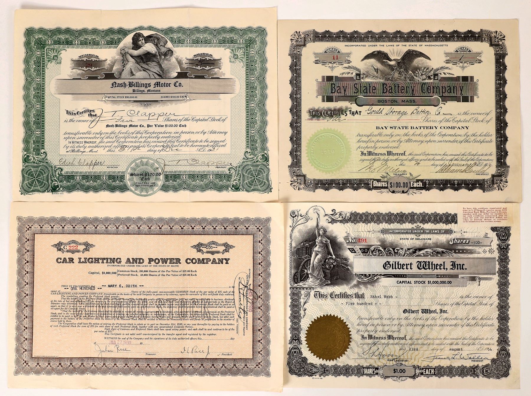 Auto related stock certificates include, unissued Gilbert Wheel Incorporated, Car Lighting and Power Company, and Bay State Battery Company. Please see photos for more details. 1900s