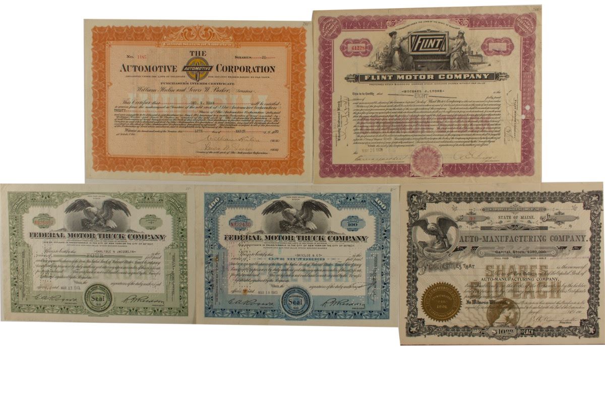 Five Certificates: Federal Motor (2), Automotive Corp., Auto-Manufacturing Co., Flint Motor Co. City: State: Date: ID# 21268