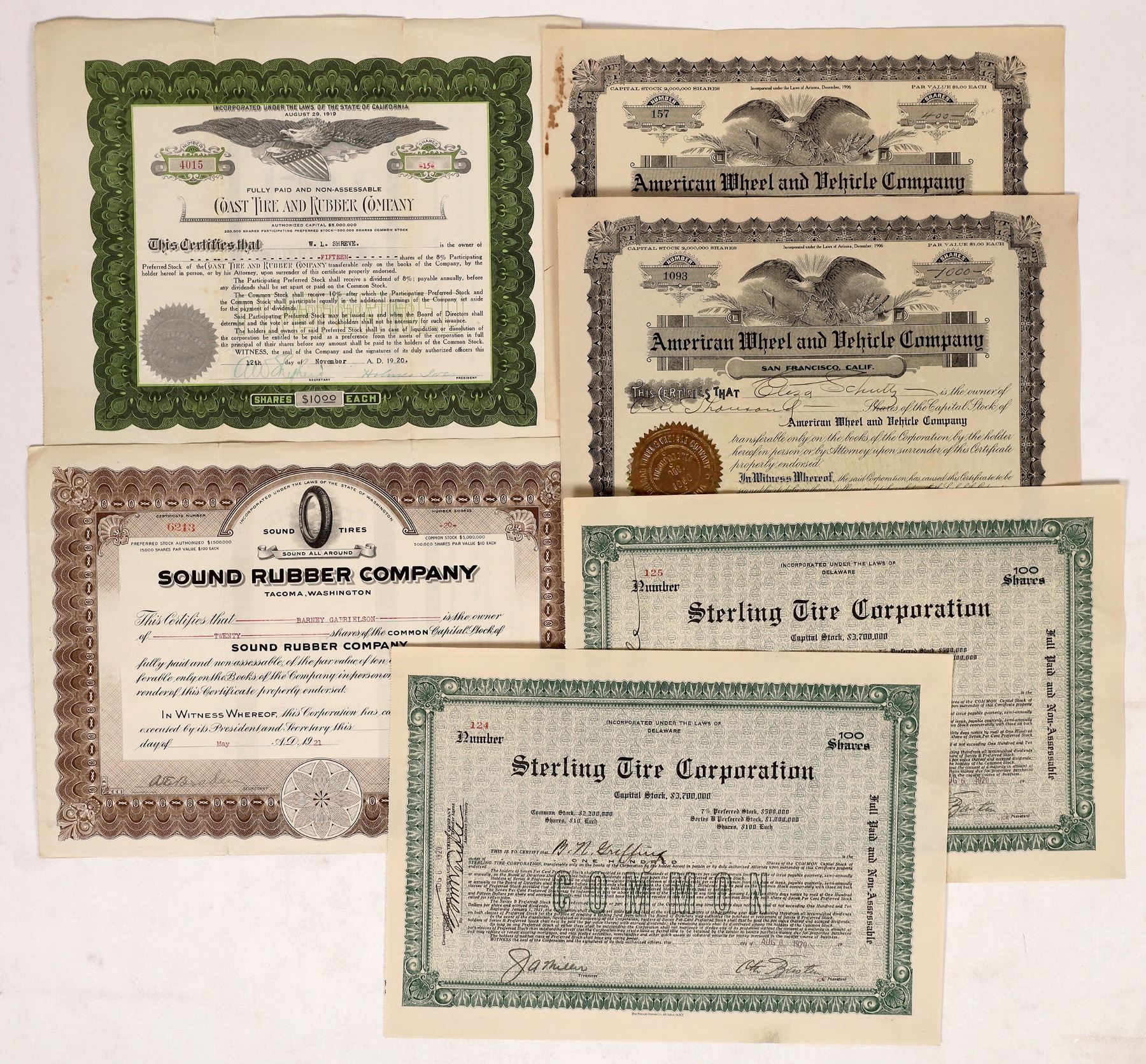 A group of six stock certificates related to the automobile tire and rubber industry, some duplicates, c1908-21. See photo(s) for more details. Ken Prag Collection