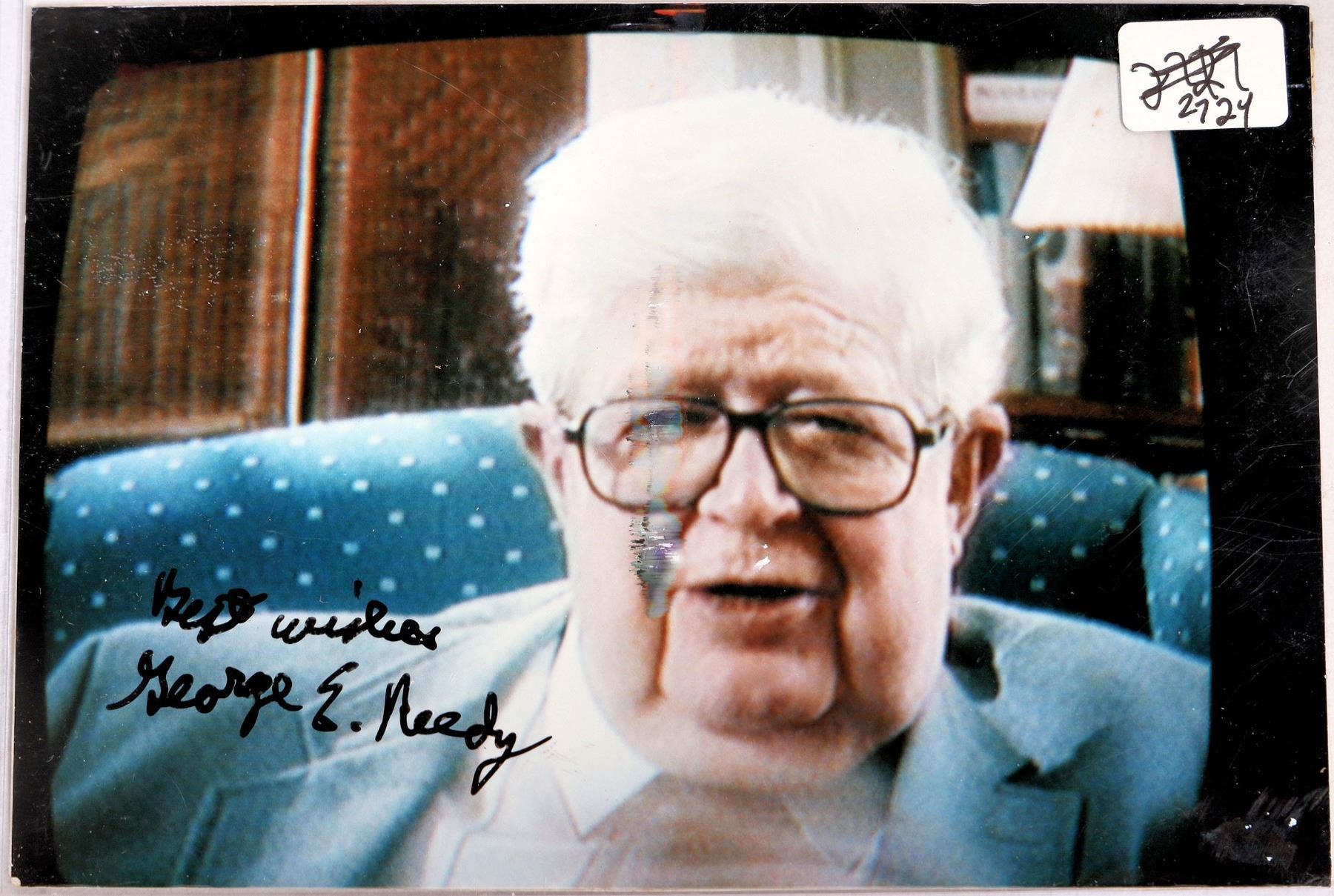 Autographed postcard of President Lyndon Johnson's press secretary George E. Reedy. Reedy succeeded Kennedy press secretary, Pierre Salinger, who resigned the position in March, 1964, about four months after Kennedy was assassinated in Dallas. The text on the card is a reply to someone as to whether Reedy had any contact with Mrs. Kennedy, during his tenure as assistant press secretary in the White House. He relates a story about retrieving a chandelier gifted to the Senate by Teddy Roosevelt, and returning it to the Executive Mansion.