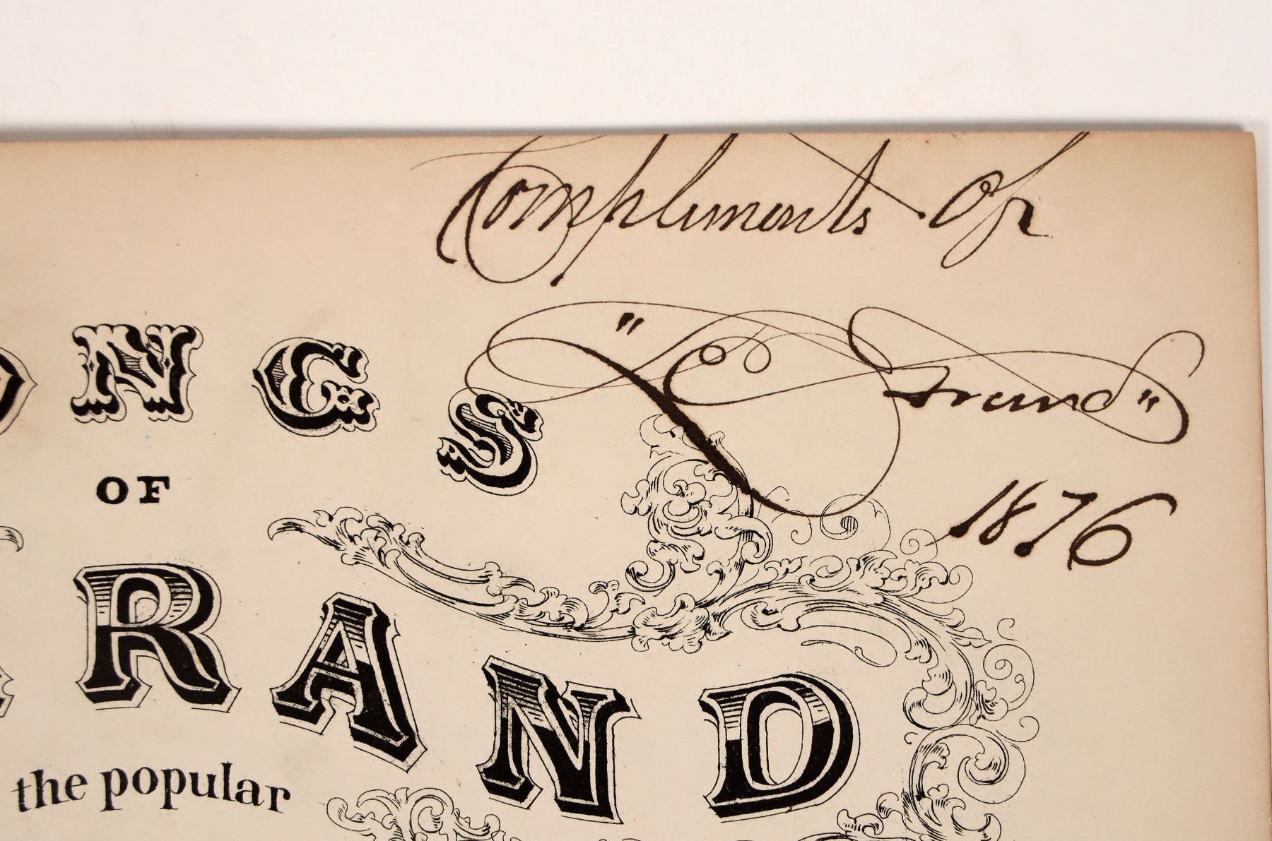 Collection of autographed sheet music, c1876-1928 (4). Includes: The Musical Comedy, "Jolly Jerome," signed by writer Roy Finch and musical composer James (Jim) Wood, 1928; "Memory's Garden," signed by musical composer Lucien Denni, 1923; "Songs of Le Grand," signed by Le Grand, 1876; "Arabesque" by Carl Fritsche, signed "Compl of the Author," copyright 1887.