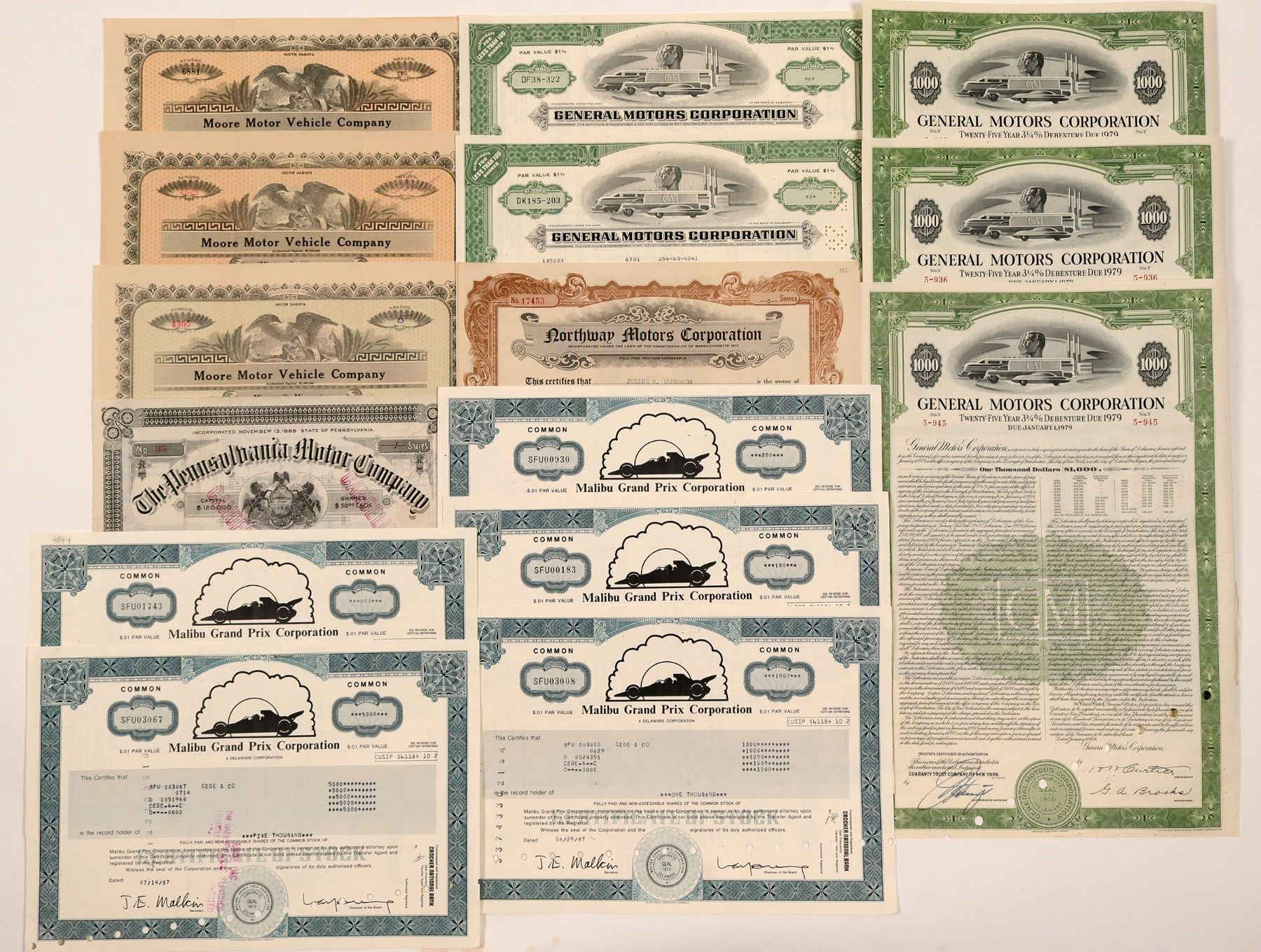 Lot of 15. Includes: Pennsylvania Motor Co. (1900); Moore Motor Vehicle Co. (3 stocks, 1918); Malibu Grand Prix Corp. ( 5 stocks, 1984-87); Northway Motors Corp (1920);General Motors Corp. (3 bonds, 1954); and General Motors Corp. (2 stocks, 1971-72). Please inspect. Ken Prag Collection