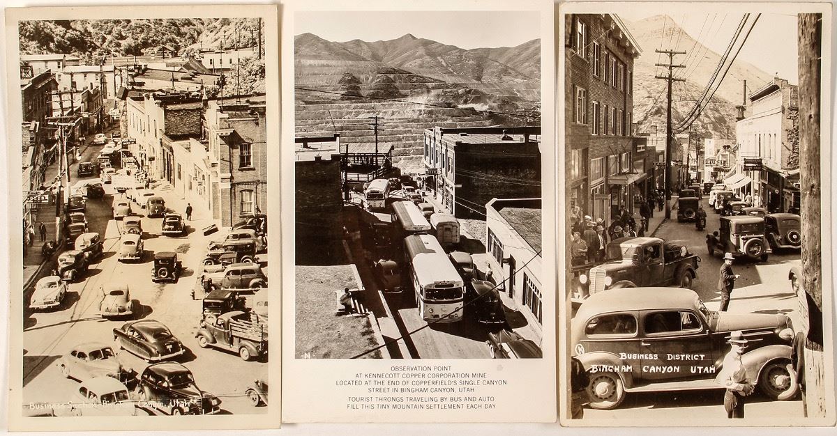 Three RPC's of automobiles. 1) Business District, Bingham Canyon, Utah. 2) Observation Point at Kennecott Copper Corporation Mine Located at the End of Copperfield's Single Canyon Street in Bingham Canyon, Utah. Tourist Throngs Traveling by Bus and Auto Fill this Tiny Mountain Settlement Each Day. 3) Street scene in Bingham. (Prag Collection) City: Bingham Canyon State: Utah Date: ID# 44464