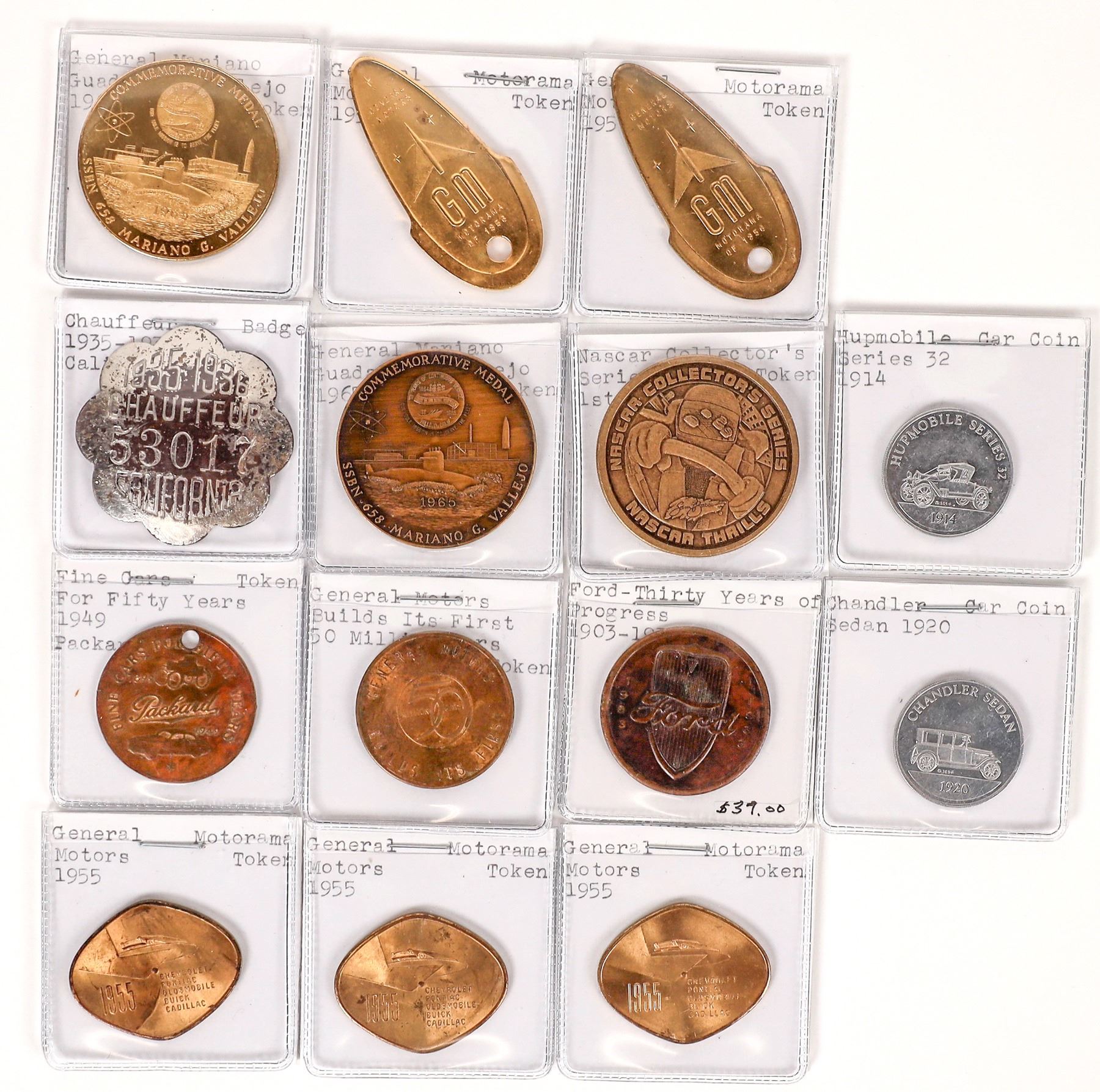 Lot of 13 medals and a 1935-36 California Chauffeur badge. Medals include: 1955 General Motors Motorama (3); 1956 Motorama (2); Nascar Collectors Series; Ford; Packard; Hupmobile; Chandler.