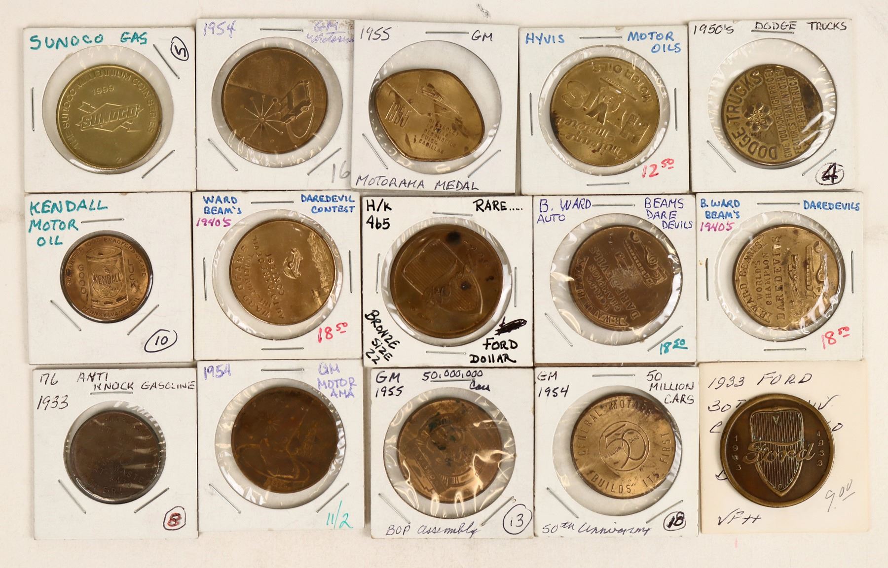 Lot of 15 medals concerning automobiles: Ward Beams Dare Devils 1940s (3); HK-465 Ford 1933 30th anniversary (2); Kendall Motor Oil; Sunoco Gas; 1954/1955 General Motors; Hyvis Motor Oils; 1950s Dodge trucks. [