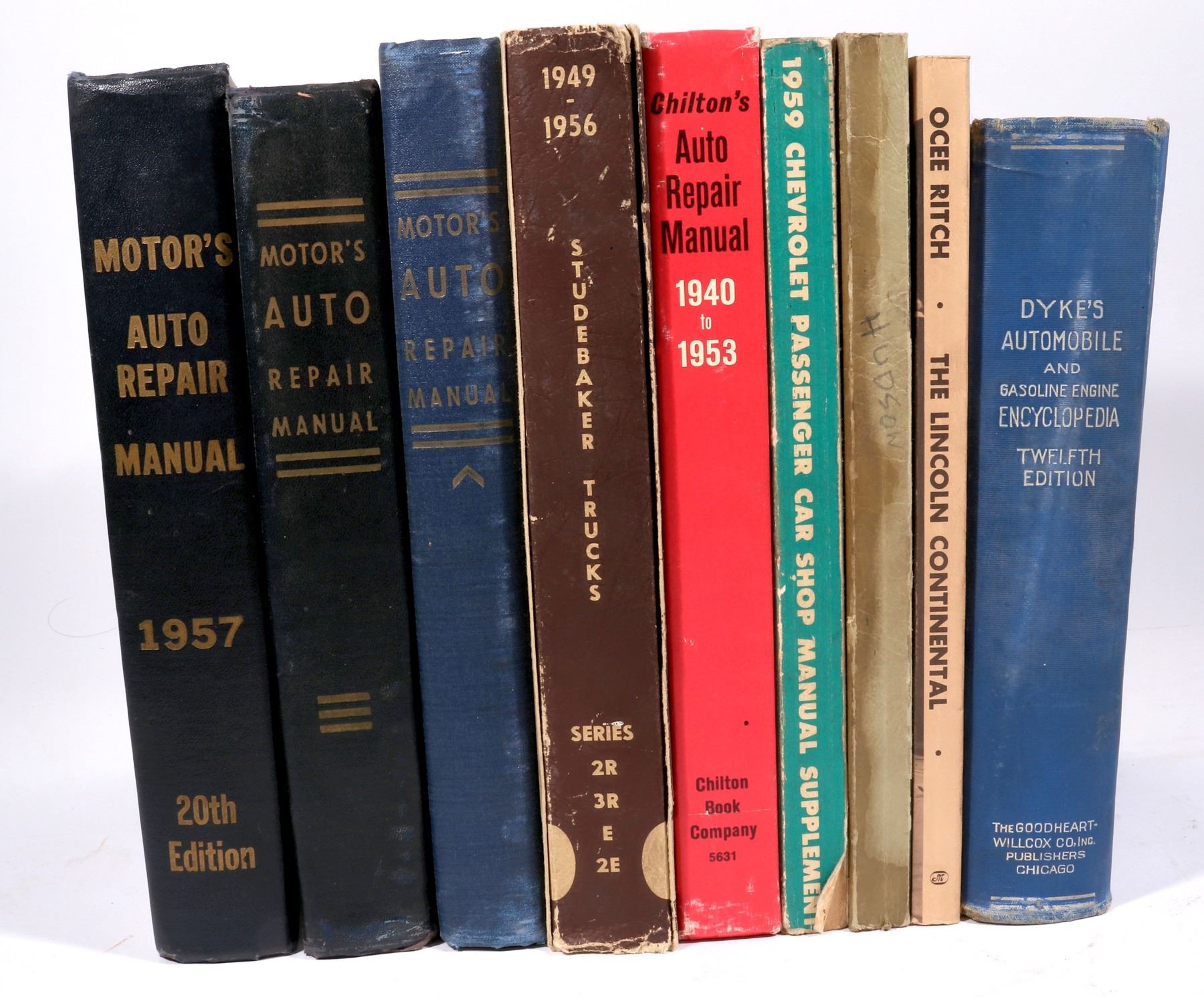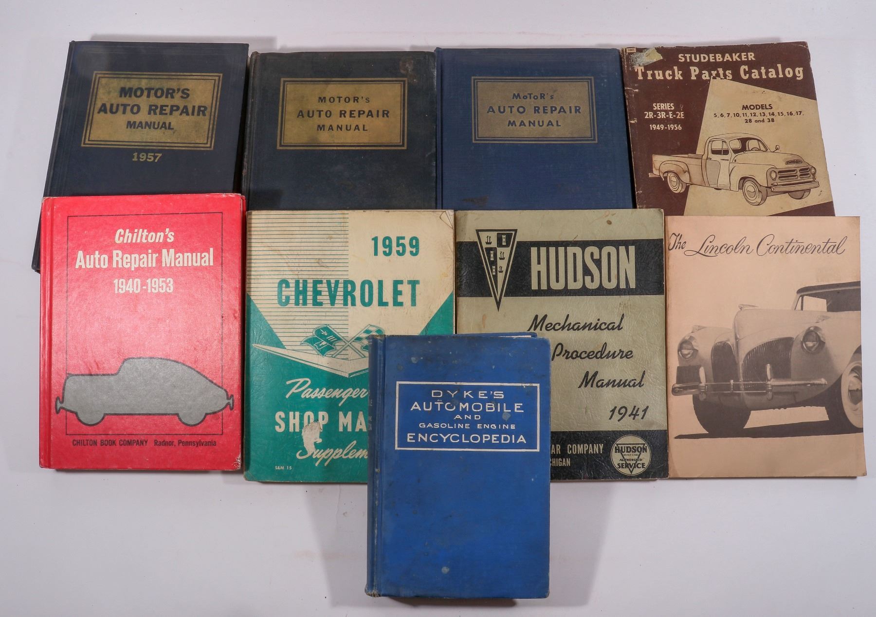These repair manuals are priceless information for the restorer. Motor's Repair Manual for all cars built between 1935-1953, Buick to Willeys pp.850; Motor's Repair Manual for all cars built between 1935-1948 American Bantan to Willeys pp. 701; Studebaker Truck Parts Catalog 1946-1956 September 1956, pp.576 paperback cover; Chilton's Auto Repair Manual 1940-1953 repinted 1971 pp. 752; Dyke's Automobile and Gasoline Engine Encyclopedia pp. 940; Chevrolet Passenger Shop Manual supplement 1959; Hudson Mechanical Procedure Manual 1941 paperback pp. 319; The Lincoln Continental paperback, 1974 pp.62, history and repair manual for the V12 engine H series 1936-1947; Motor's Auto Repair Manual 1957 hardcover covers Buick to Willys.