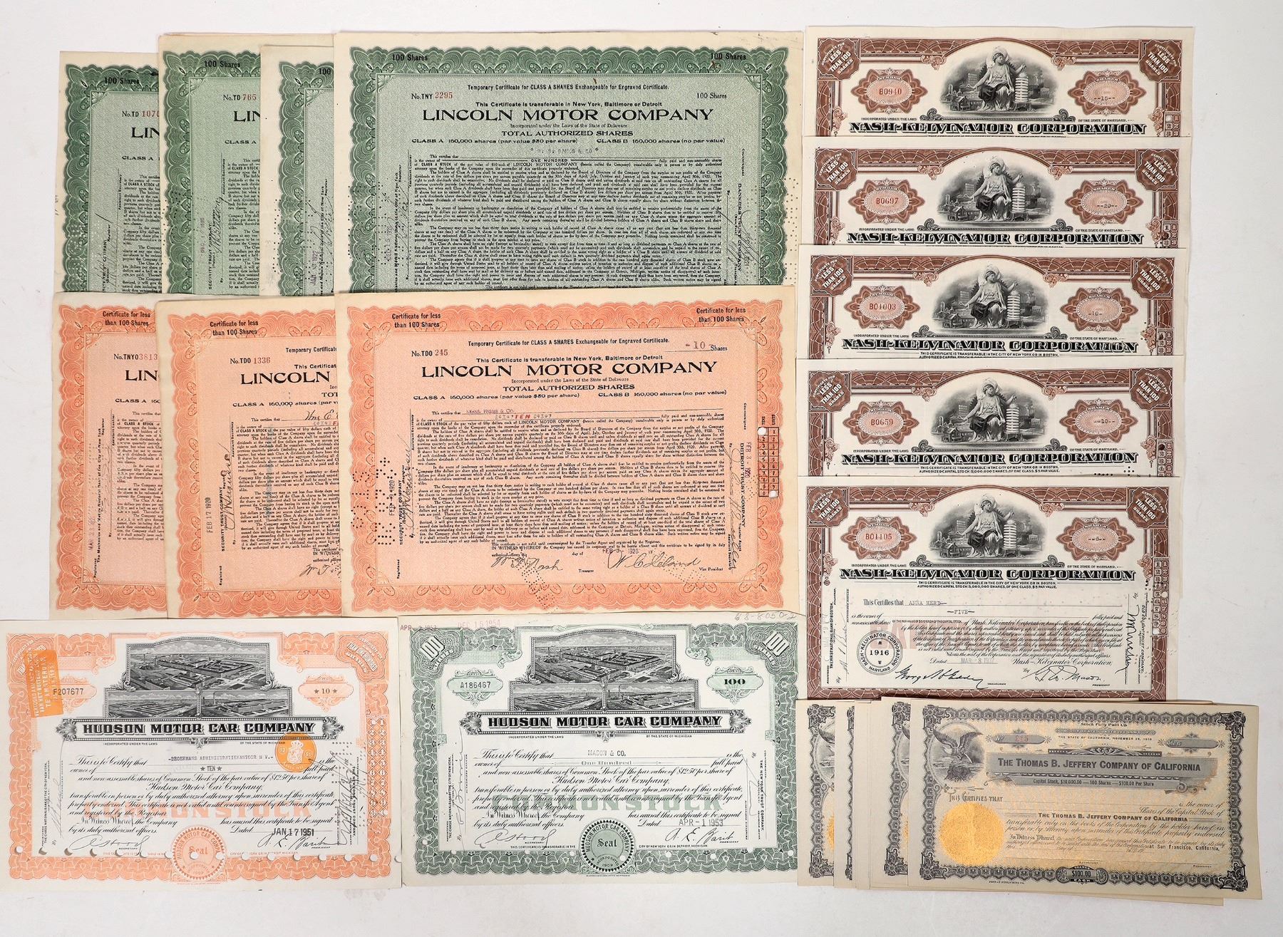About 20 automotive stocks, 1920-53. Hudson Motor Car, Nash Kelvinator, Thomas B Jeffery of California unissued, Lincoln Motor. See phot0.