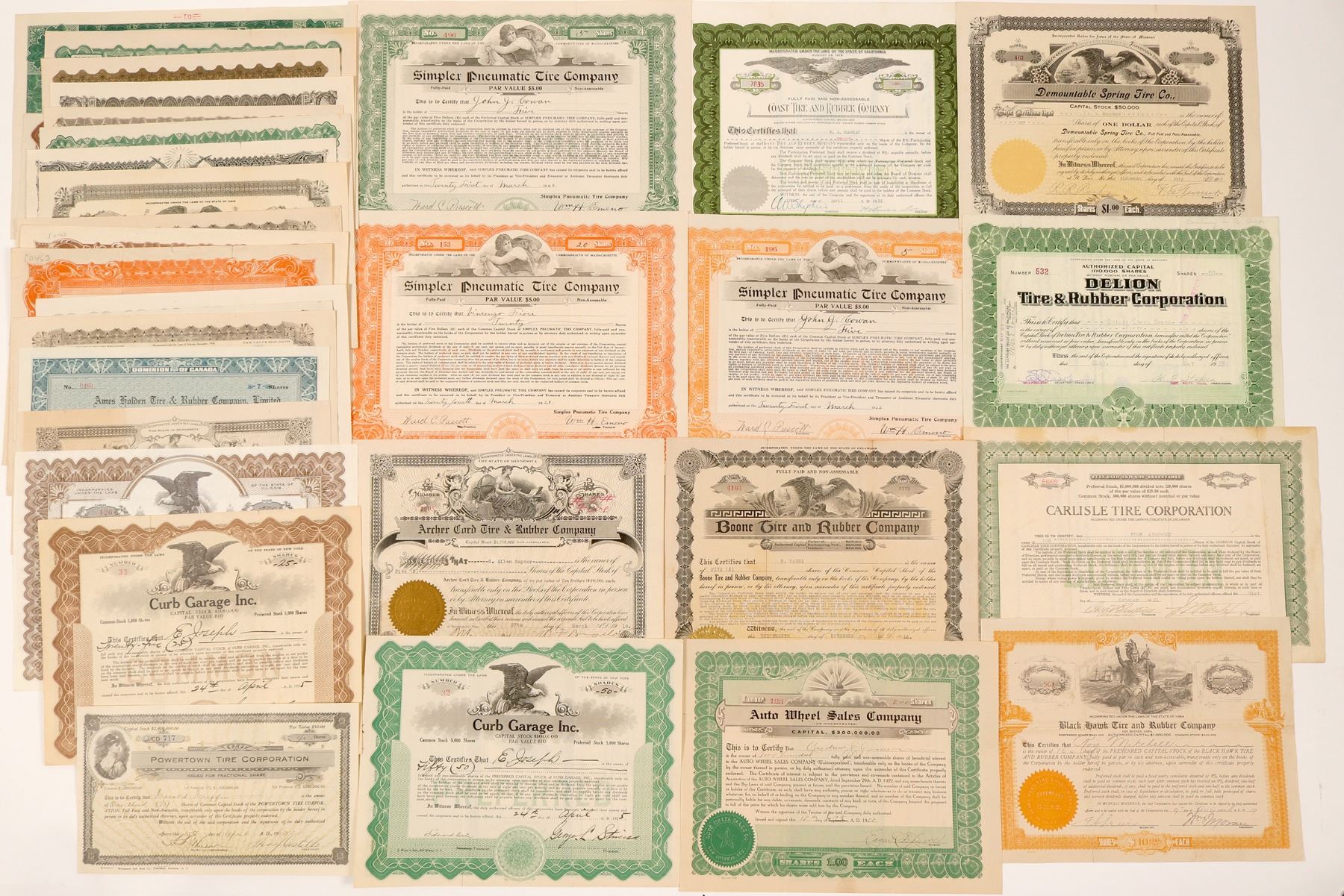 Lot of thirty-four. Nice vignettes; Delion Tire and Rubber with lion vignette and John T Clark Mechanically Inflated Tire Company with fancy car vignette. Two multi-colored stocks: Coast Tire and Rubber & Carpenter Tire and Rubber. Early numbers include: Templar Tire Company #2, American Rubber #4, Clark Tire and Demountable Rim #20, Autolife Tire Chain #19A, Armocord Tube Company of the District of Columbia #30. Also Greenwich Rubber, George Grow Tire (signed by Crow), two different American Wheel and Vehicle of San Francisco, two different Coast Tire and Rubber, Toliver Tube and Tire of Denver, American Tire, Ames Holden Tire and Rubber, two different Archer Cord and Tire, Armored Tire and Rubber, two different Curb Garage, Black Hawk Tire and Rubber of Des Moines, Autor Wheel, Boone Tire and Rubber, Demountable Spring Tire, Carlisle Tire, Powertown Tire, two different Simpler Pneumatic Tire, etc. Ken Prag Collection