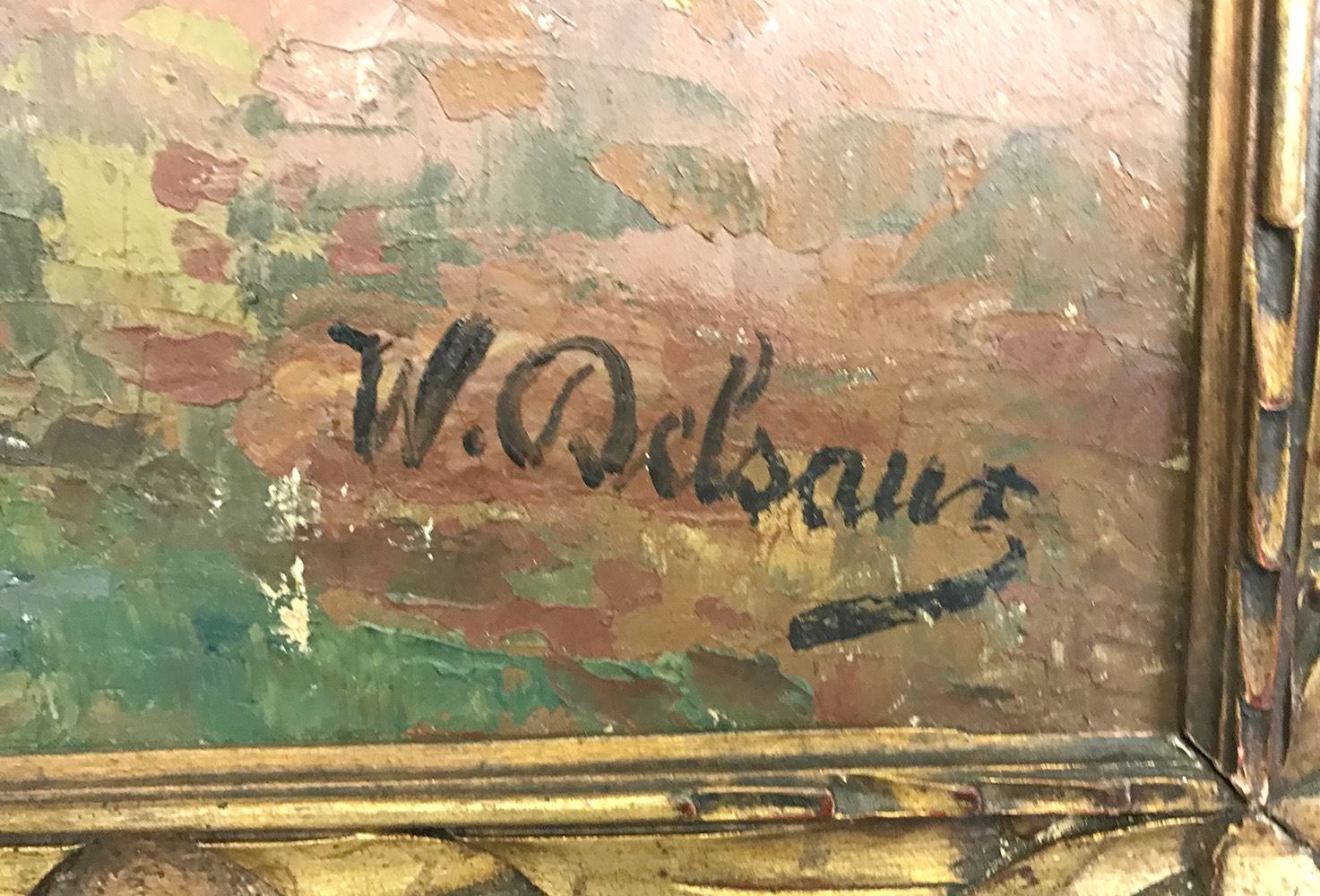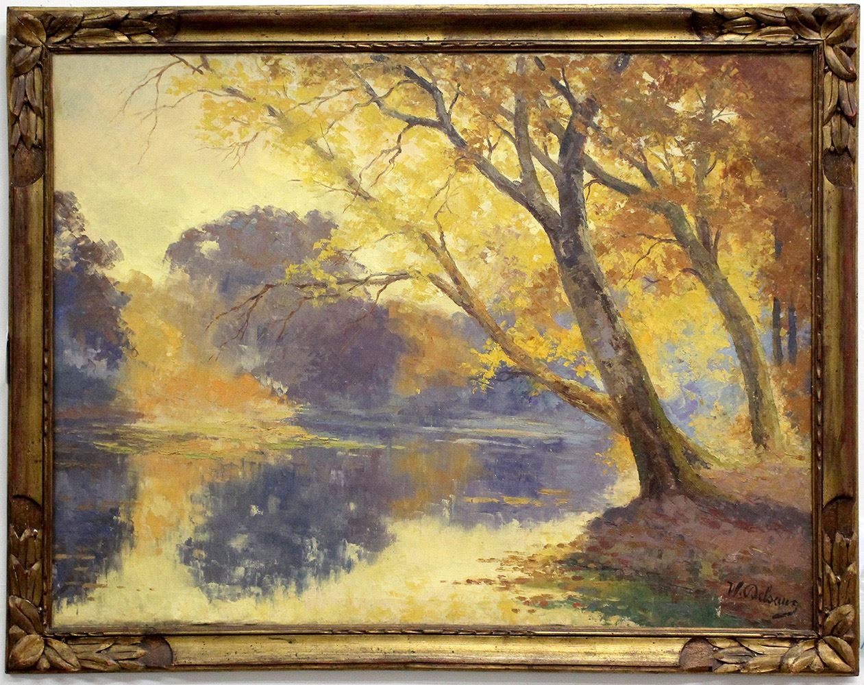 Autumn Landscape by Willem Delsaux (1862-1945). Oil painting, 31.5" x 41.5", framed 36" x 46". Delsaux began with law studies, but after a year he gave it up. He chose for an artistic career and followed a training in decorative painting at the Academy of Fine Arts in Brussels from 1878 to 1880. There he was taught, amongst others, by the landscape painter Joseph Quinaux. Delsaux couldnÕt adjust to the academic conventions and his education didnÕt last very long. Willem Delsaux mainly painted seascapes and landscapes. He was also an etcher, lithographer and sculptor. The regions and sites he visited and portrayed were: Brussels and surrounding areas. Painting in very good condition, signed and in original frame. Date: Location: HWAC# 57802