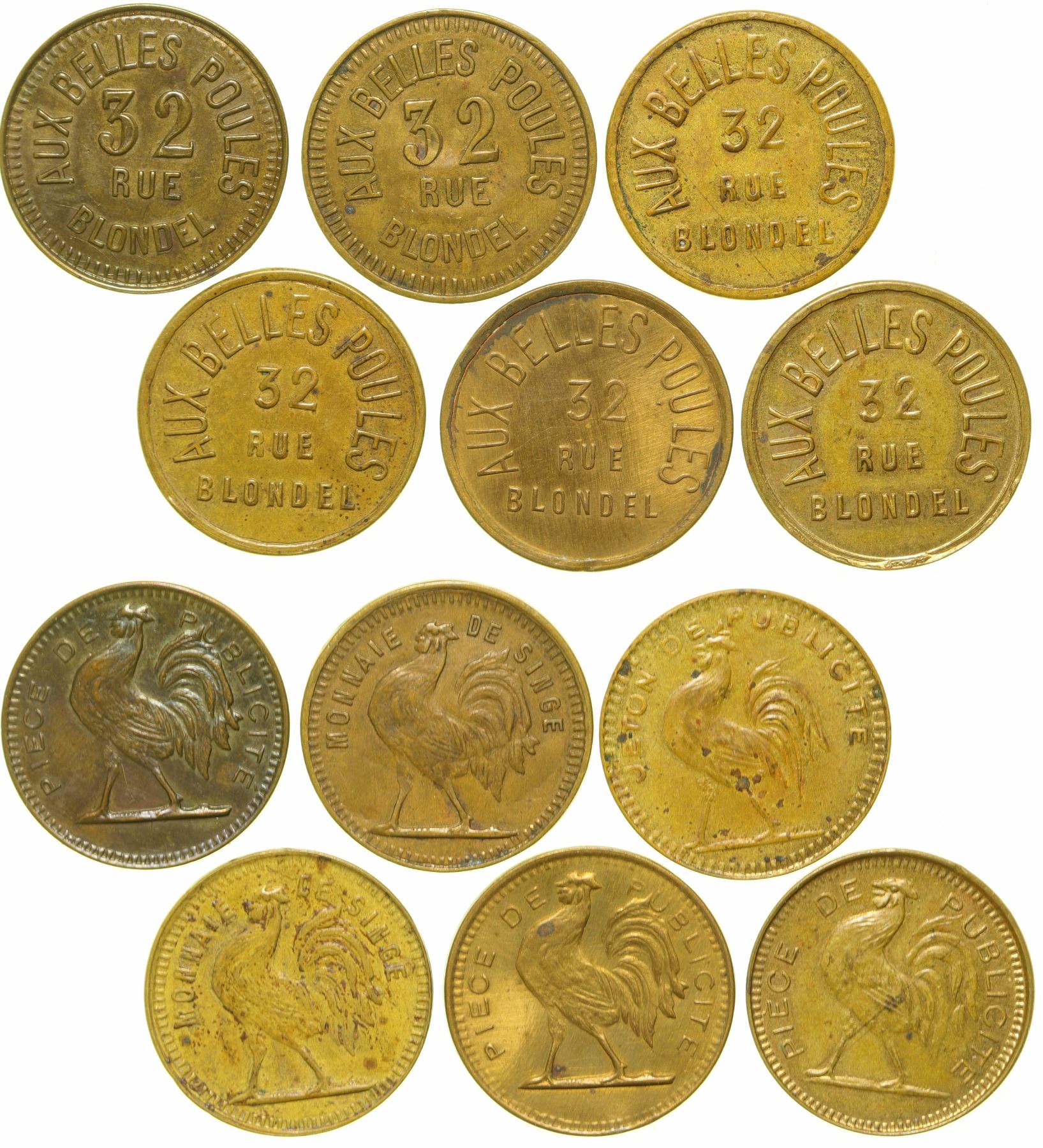 Lot of six different types of tokens from Aux Belles Poules at 32 Rue Blondel in Paris. All Br., rd., and 21 mm.