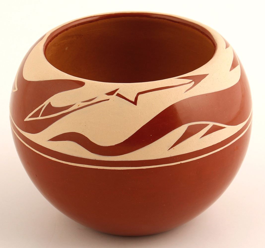 Avanyu pot by Earlene Youngbird. Polished redware with cream colored matte modern design of Avanyu (water serpent), 4" h x 5" diameter. Earlene Youngbird-Tafoya (1947-2008) was known for her polychrome redware pottery. She was a daughter of Felix and Adelaide Silva Sisneros and a daughter-in-law of Mida Tafoya. Her husband was Robert Tafoya. Date: Location: Santa Clara Pueblo, New Mexico HWAC # 52726