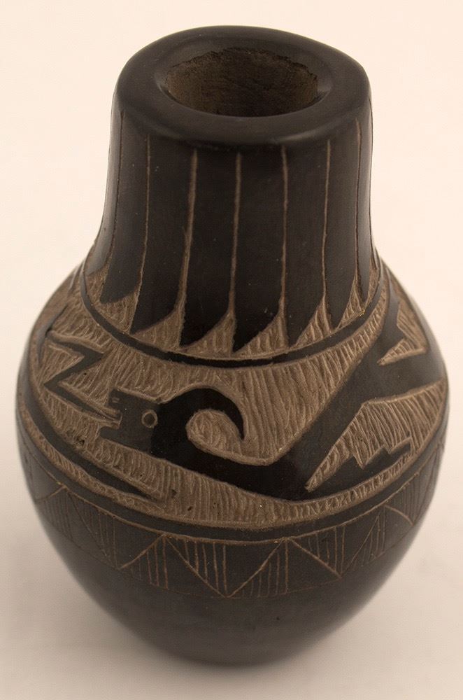 Avanyu (water serpent) vase by Corn Moquino. 2.25" h x 1.5". Beautifully etched design with feathers and avanyu. Corn Moquino is of Zia & Hopi heritage. He married into Santa Clara Pueblo and has been making Santa Clara style pottery since around 1963. He is one of the earlier potters to employ sgraffito style carving. Date: c. 1992 Location: Santa Clara Pueblo, New Mexico HWAC # 49377